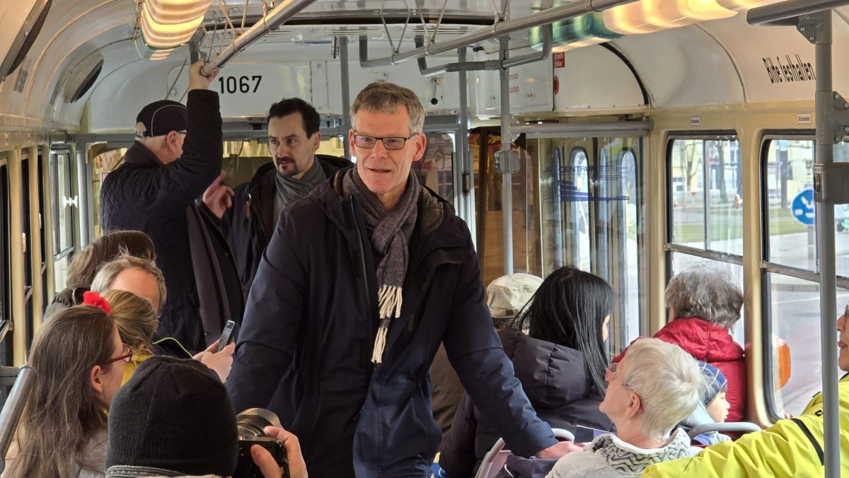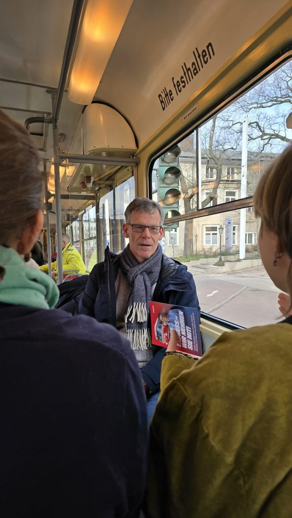 Für seine Aktion hatte sich Geier eine Straßenbahn bei den Halleschen Straßenbahnfreunden (HSF e.V.) gemietet. Somit kommt der Wahlkampf direkt den ehrenamtlichen Helfern des Straßenbahnvereins zu Gute. Übrigens lassen sich dort nicht nur für “Wahlkampfzwecke” Straßenbahnen mieten, sondern auch für alle anderen Festivitäten.