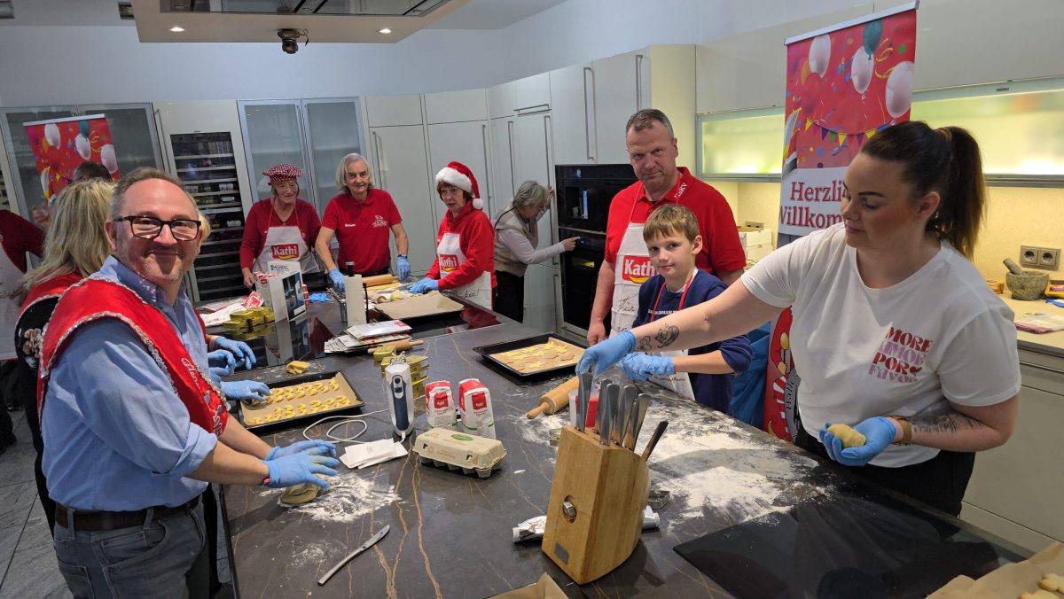 Unter Mehlstaub und Weihnachtsduft standen das Stadtprinzenpaar, seine Tollität Henrik I. und Ihre Lieblichkeit Julia II., gemeinsam mit weiteren Helfern des HSKV in der modernen Küche des Küchenstudios Micheel am Hansering. Hier wurde fleißig geknetet, gerollt und ausgestochen. Unterstützt wurde die Aktion von der Firma Kathi, die großzügig Backmischungen zur Verfügung stellte.