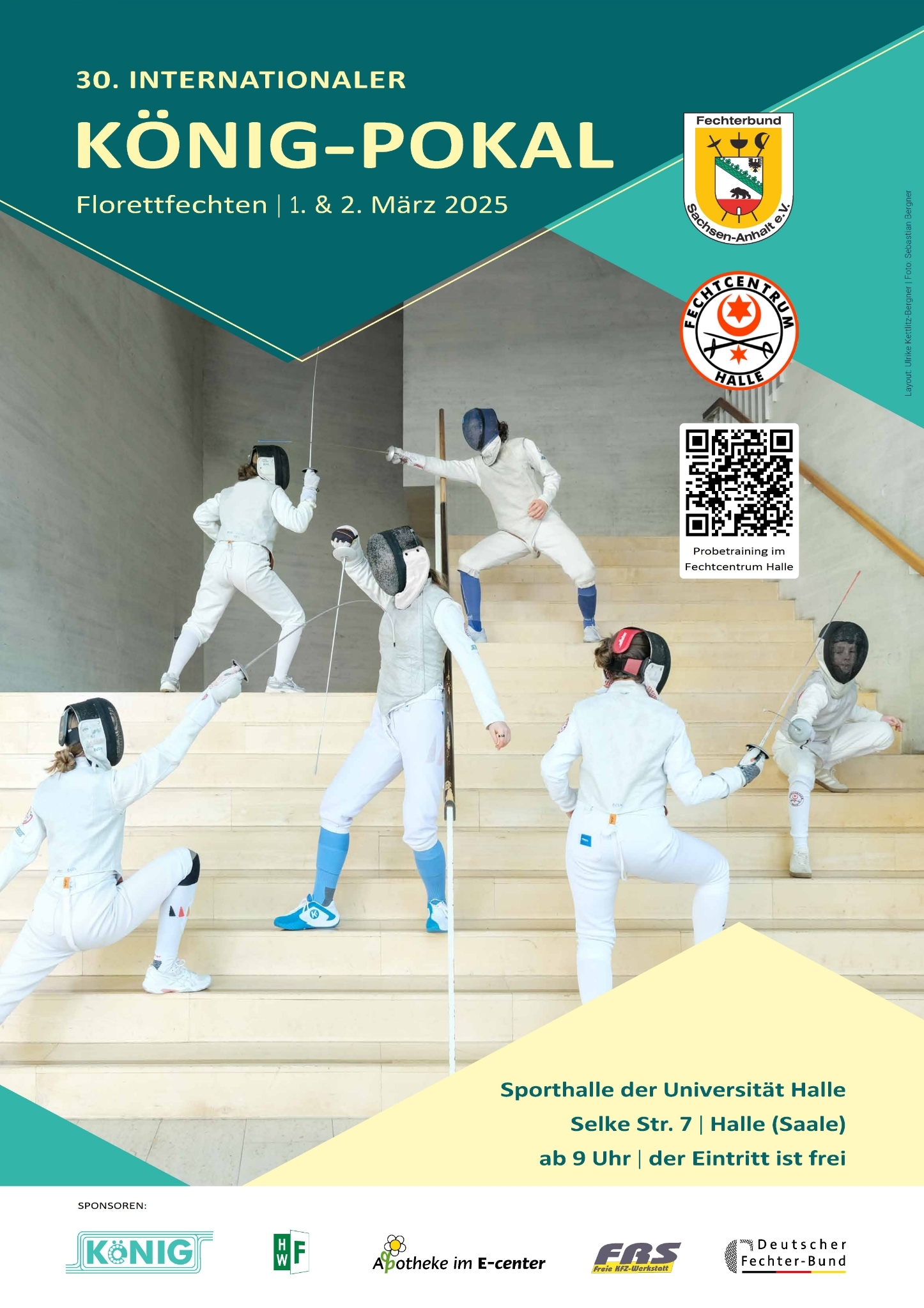 An diesem Wochenende, dem 1. und 2. März, findet in unserer Stadt Halle zum 30. Mal der Königspokal im Florettfechten für die Altersklassen U15 und U17 statt. Wer Interesse hat europäische und deutsche Nachwuchsfechter auf der Planche live zu erleben der ist dieses Wochenende in der Universitätssporthalle in der Selkestraße herzlich willkommen.