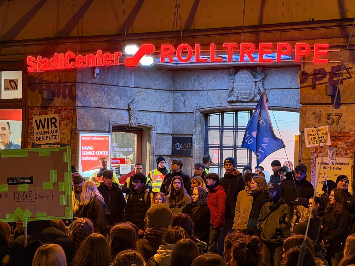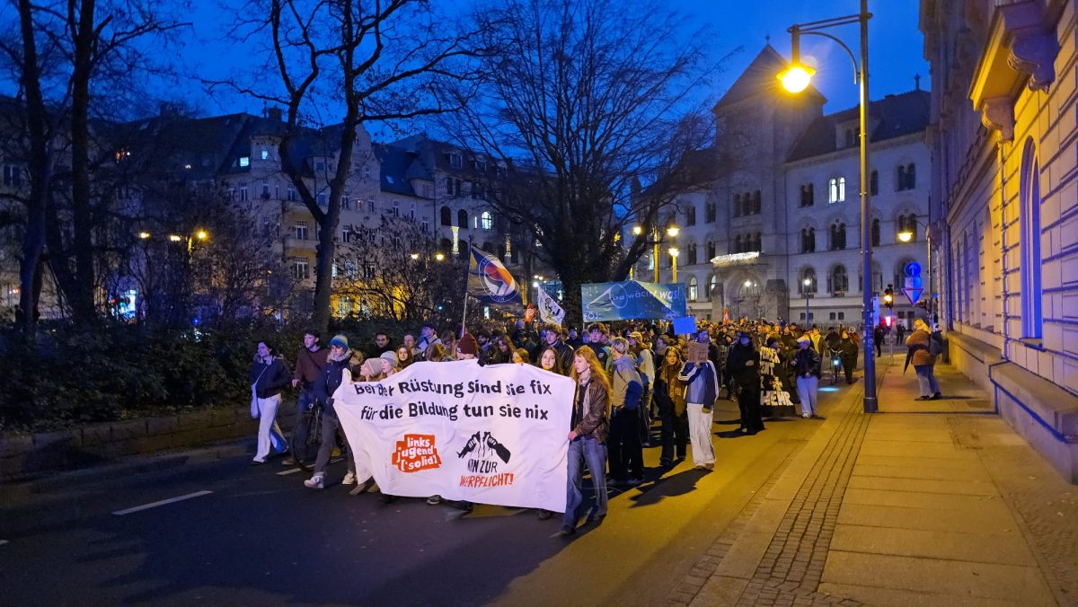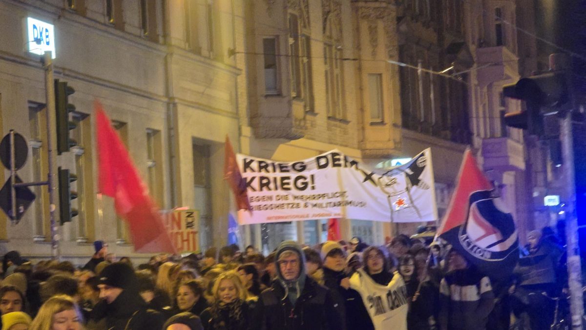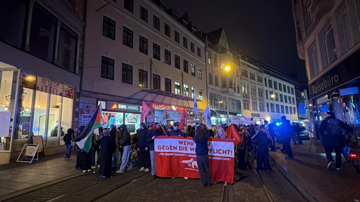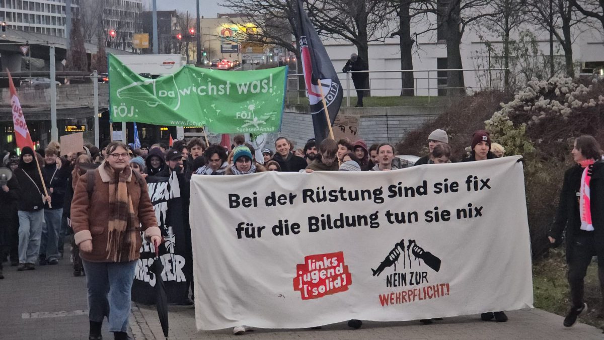 Der Freitagnachmittag am halleschen Riebeckplatz begann laut und eindringlich. Aus großen Lautsprechern dröhnte der Hit „Boom, Boom, Boom, Boom – ich bring euch alle um“ der HipHop-Band K.I.Z., der in dieser Situation weniger als Partyhymne, sondern vielmehr als provokanter Auftakt eines politischen Protests diente. Wenige Stunden zuvor hatte der Bundestag die Wiedereinführung der Wehrpflicht beschlossen. Für viele der Demonstrierenden war dies ein unerträglicher Rückschritt, und so erhoben sich am verkehrsreichen Platz Banner, Fahnen und Plakate, auf denen Forderungen wie „Nie wieder Krieg“, „Frieden braucht keine Waffen“ und „Krieg dem Krieg“ zu lesen waren. Die Atmosphäre war aufgewühlt, aber friedlich, getragen von dem Gefühl, dass hier eine Generation ihre Zukunft bedroht sieht. Die Sozialistische Deutsche Arbeiterjugend (SDAJ) und die Linksjugend Solid hatten zur Demonstration aufgerufen, der sich nach Polizeiangaben rund 400 überwiegend junge Menschen anschlossen.