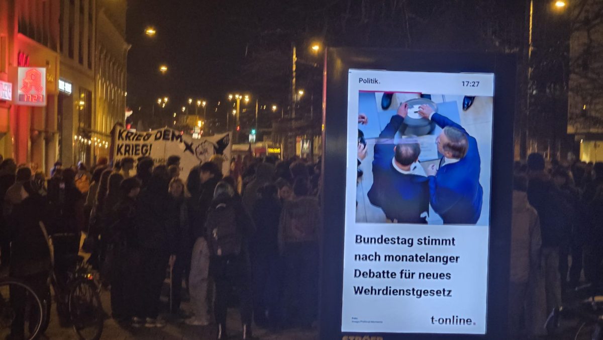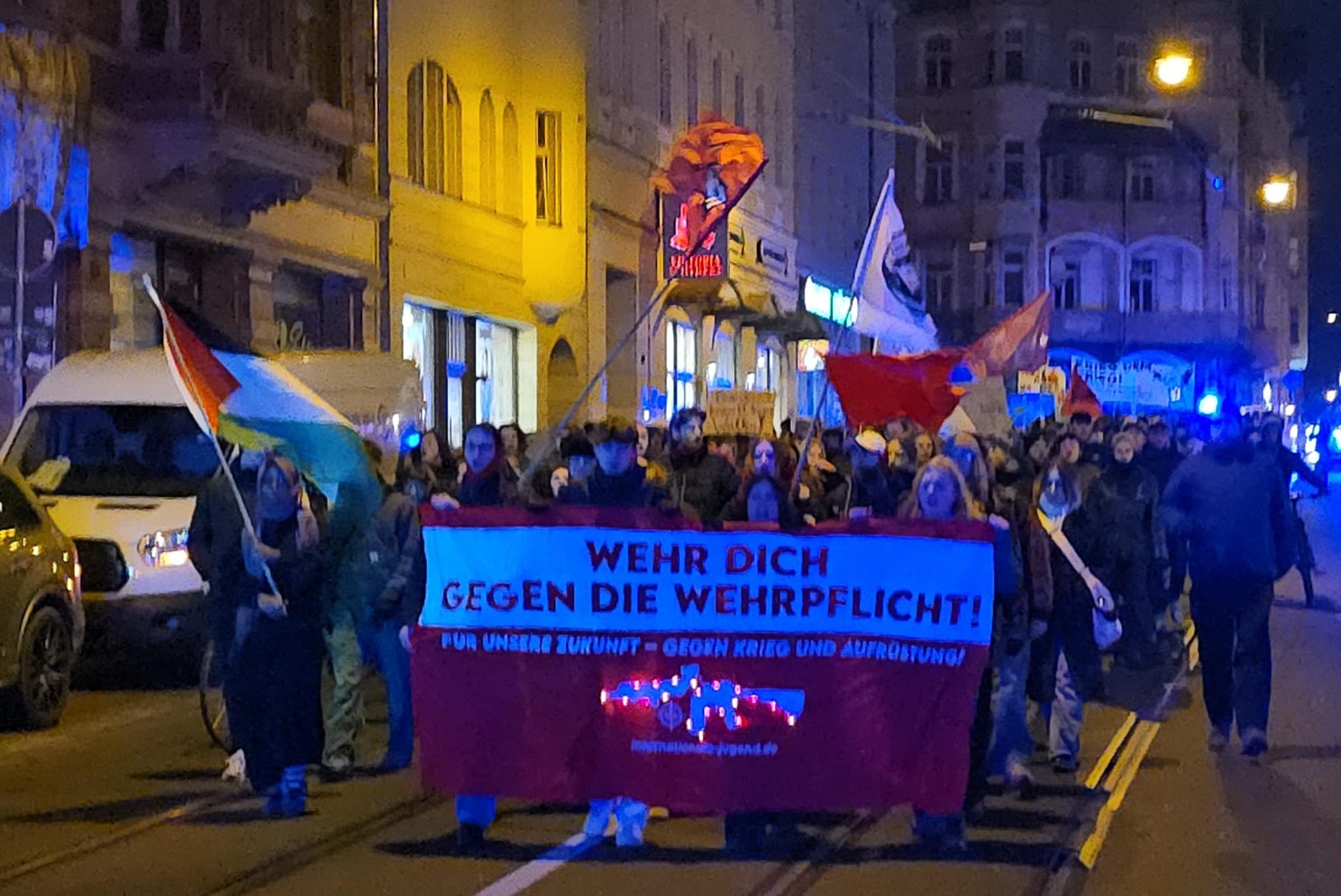 Der Protest blieb nicht auf den Nachmittag beschränkt. Am Abend folgte eine weitere Demonstration, die von der Internationalen Jugend und dem Solidaritätsnetzwerk organisiert wurde. Dieses Mal nahmen etwa 300 Menschen teil. Inhaltlich ähnelte die Demonstration der ersten, doch war die internationale Dimension stärker sichtbar, unter anderem durch geschwenkte Palästina-Fahnen und wiederholte Bezugnahmen auf globale Konflikte. Die Demonstration blieb erneut friedlich, aber geprägt von großem Engagement und einer ungebrochenen Wut über die geplante Wehrpflicht.