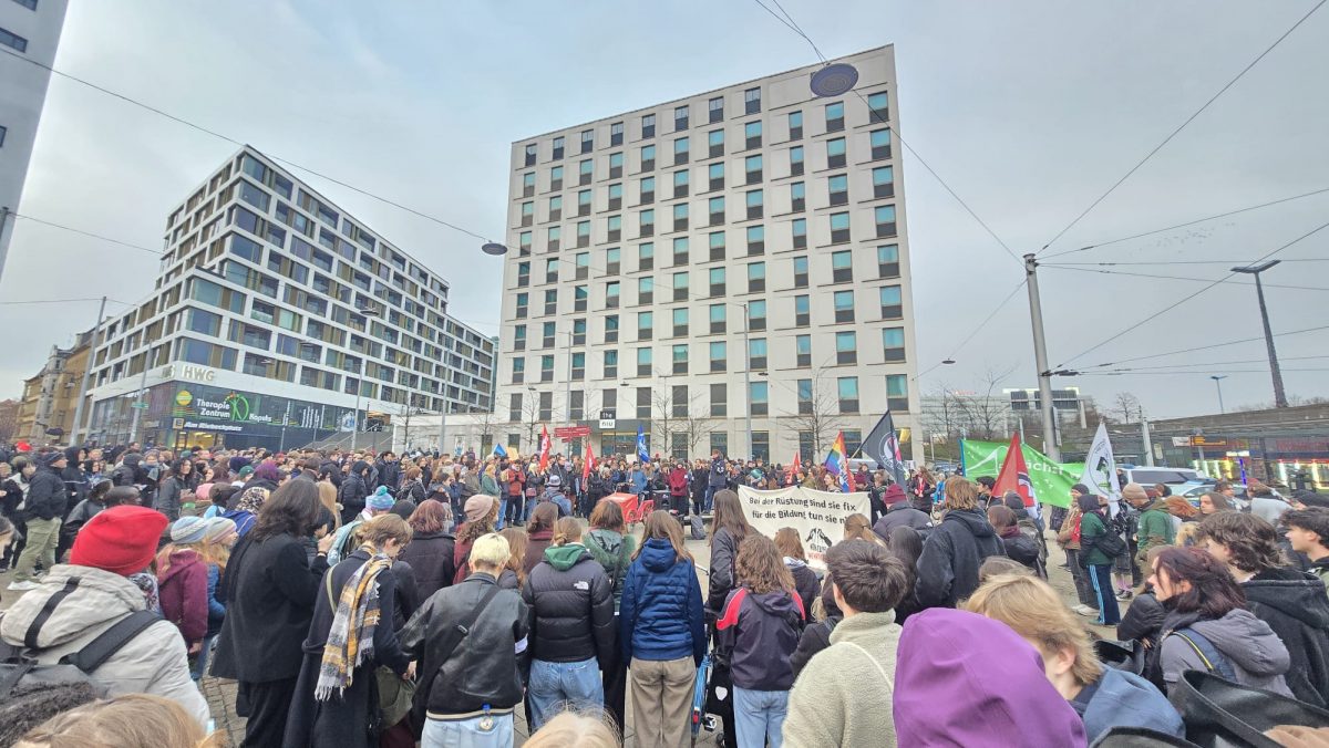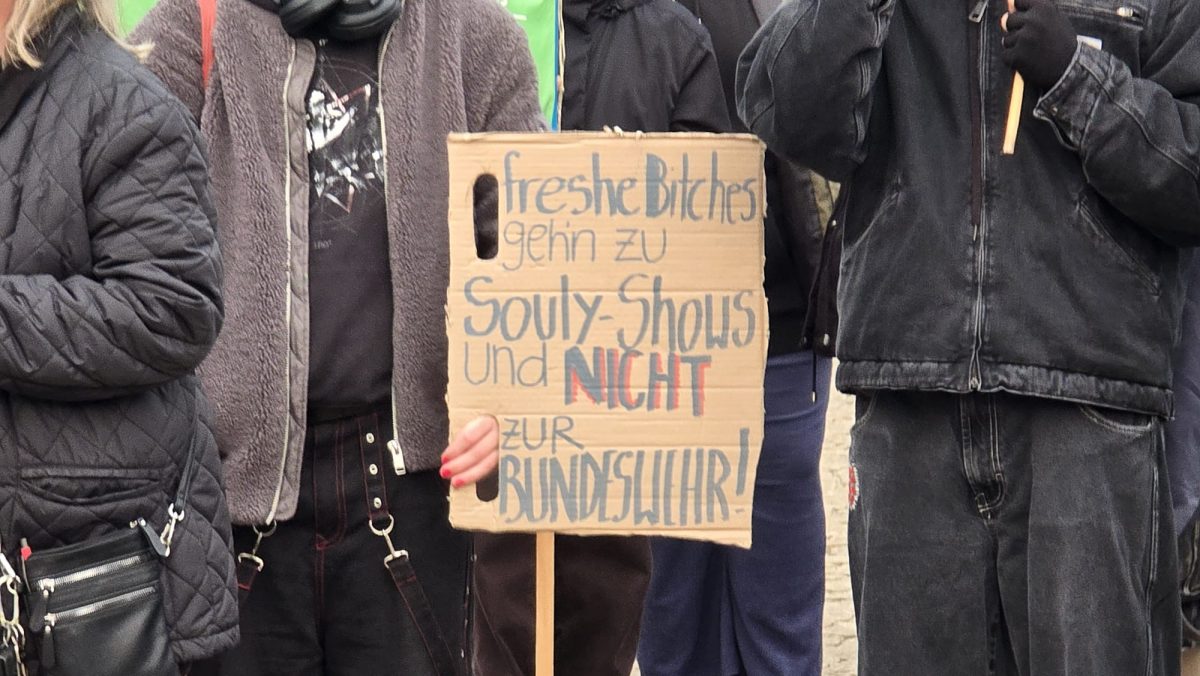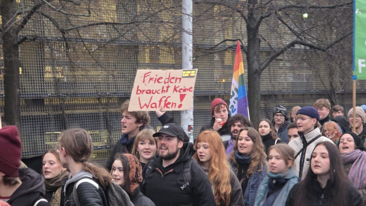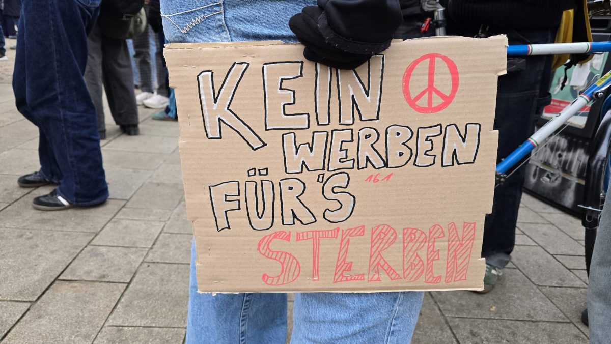 Der Protestzug setzte sich langsam in Bewegung und bahnte sich seinen Weg durch die Innenstadt. Die Sprechchöre hallten zwischen den Gebäuden wider und artikulierten die ablehnende Haltung zur Militarisierung. Immer wieder riefen die Teilnehmenden Parolen gegen Aufrüstung und gegen eine Rückkehr zum Pflichtdienst. Auch Themen wie soziale Ungleichheit, staatliche Prioritäten und fehlende Perspektiven für junge Menschen flossen in die Rufe ein und spiegelten die Vielzahl an Motiven, die diese Menschen auf die Straßen trieb. Während die Demonstrierenden zum Universitätsplatz zogen, mischten sich auch Rufe zum Nahostkonflikt in die Menge. Mehrfach ertönte „Israel bombardiert, Deutschland finanziert“, womit deutlich wurde, dass die Debatte um Militarisierung für viele eng mit internationalen Konflikten verknüpft ist. Der Zug erreichte schließlich den Universitätsplatz, der sich innerhalb kurzer Zeit mit interessierten Passanten und Demonstrierenden füllte, die dort den Redebeiträgen lauschten.