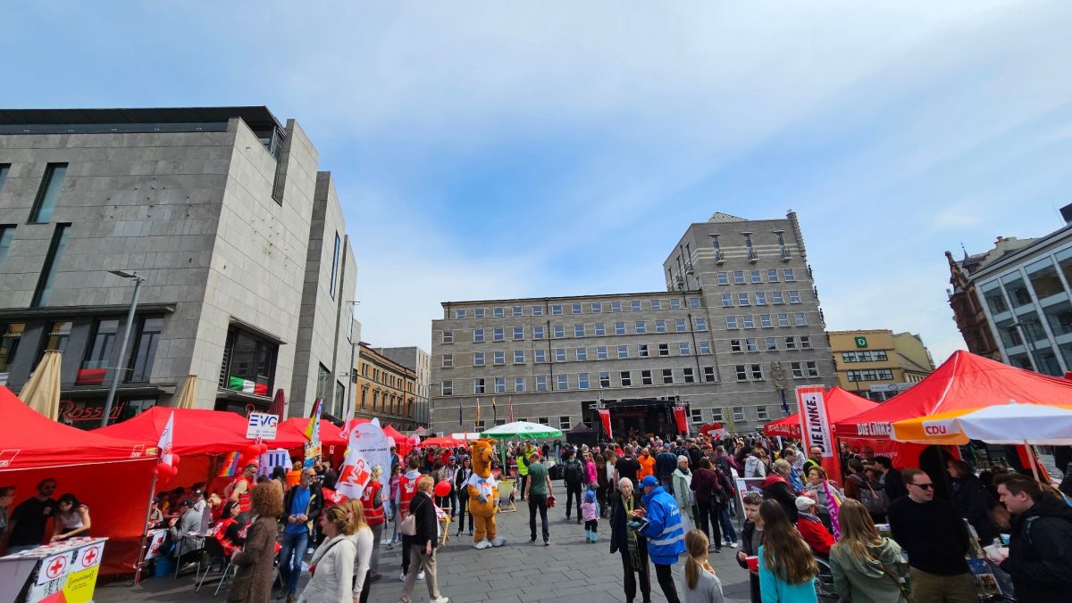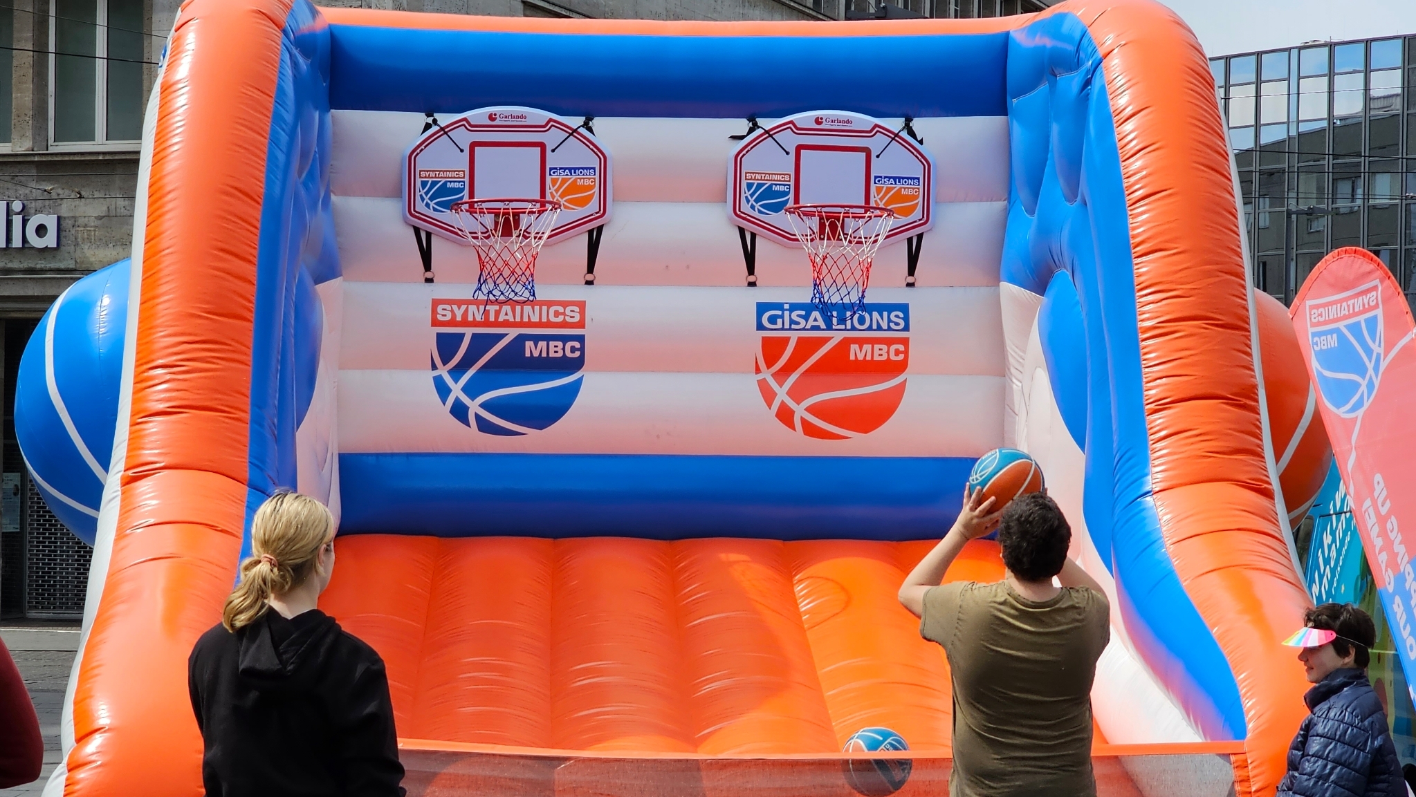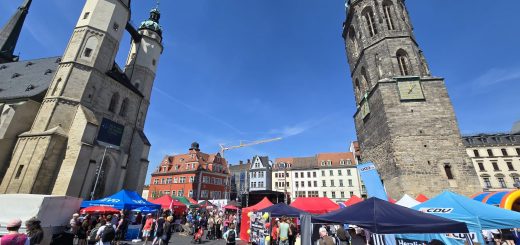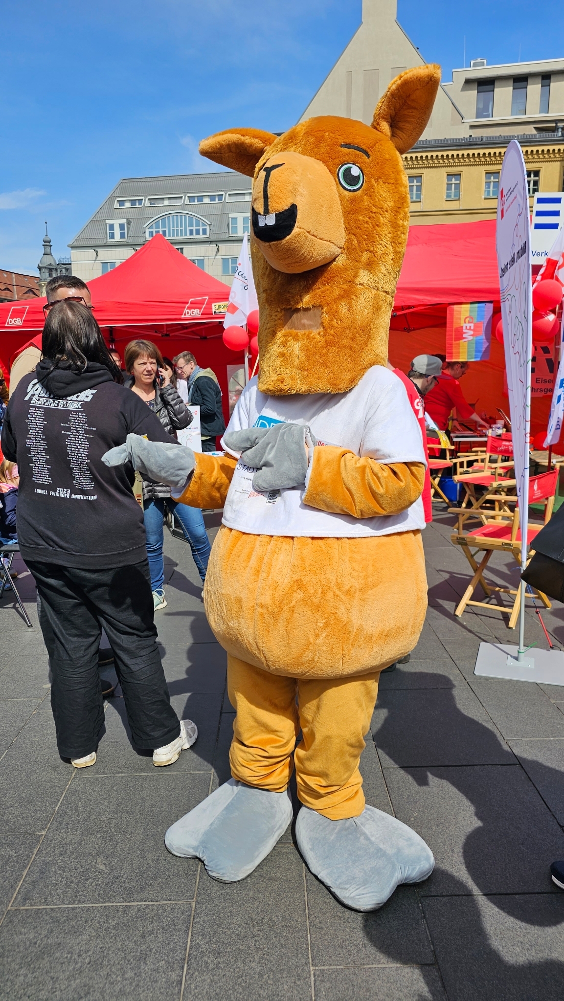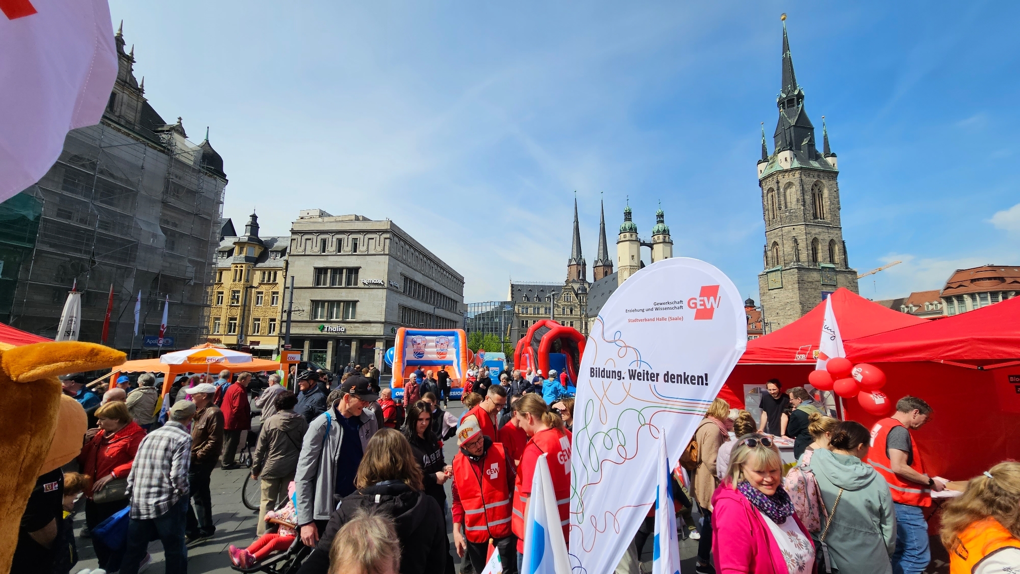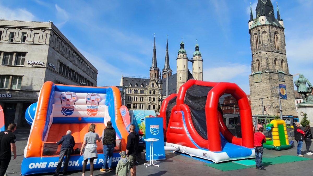 Auf dem Marktplatz in Halle (Saal) gab es am Montag eine Kundgebung zum Tag der Arbeit. Stände von Vereinen und Verbänden waren aufgebaut. Es gab Hüpfburgen für die Kinder. Und auch im Basketball konnte man sich ausprobieren. Die Basketballer*innen vom Lions-MBC und Syntainics-MBC waren da.