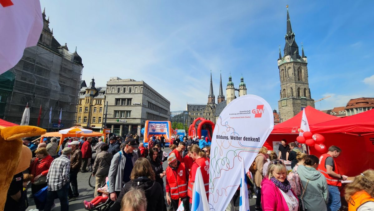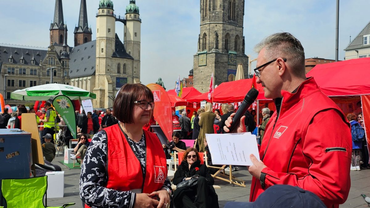 Kundgebung zum 1. Mai auf dem Markt in Halle (Saale) – Bürgermeister beklagt fehlende strukturelle Finanzierung durch den Bund beispielsweise beim Klimaschutz