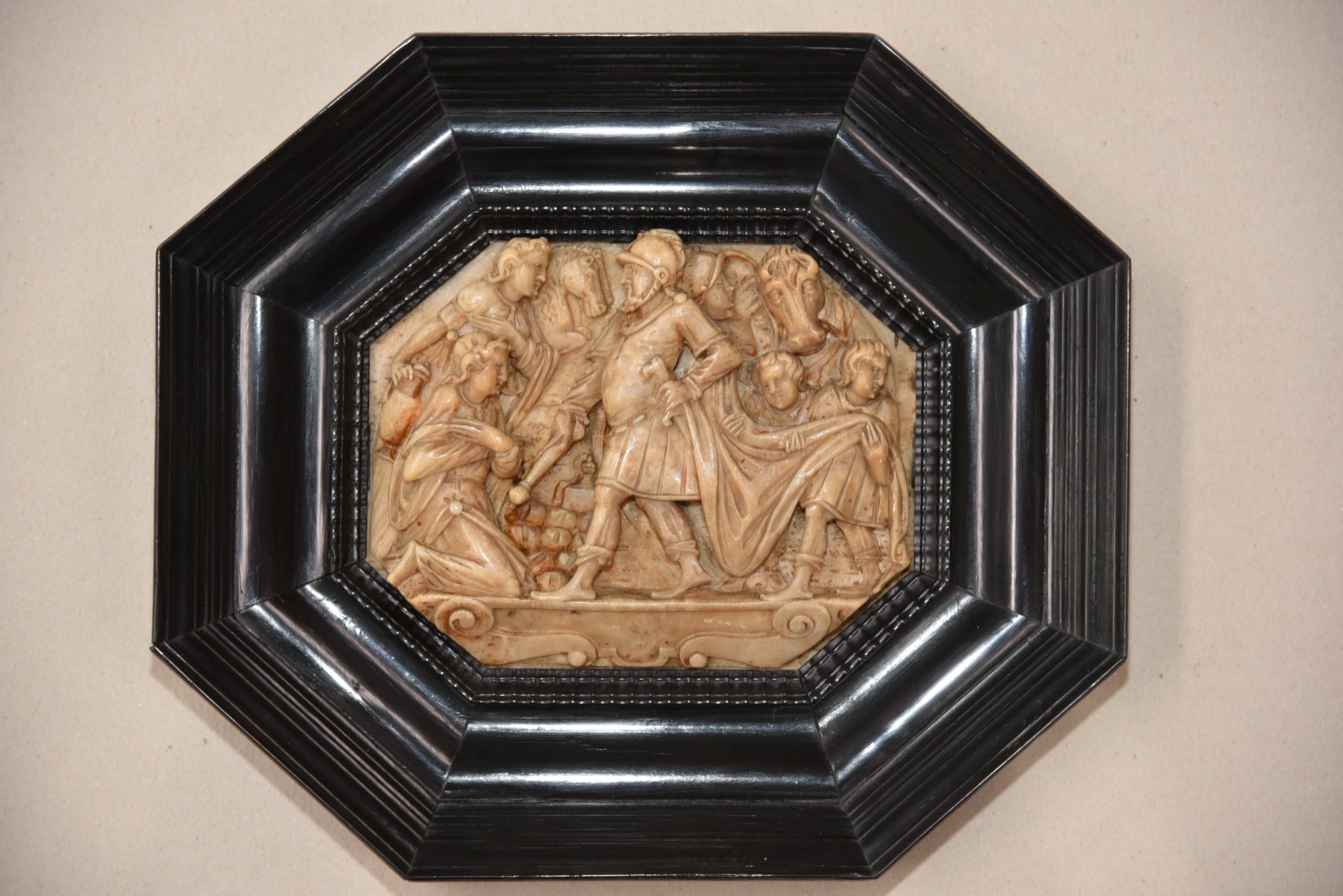 Unbekannte Werkstatt:Antikische Szene, Relief aus Alabaster im 8-eckigen Holzrahmen (Nadelholz mit Ebenholzauflage),um 1600