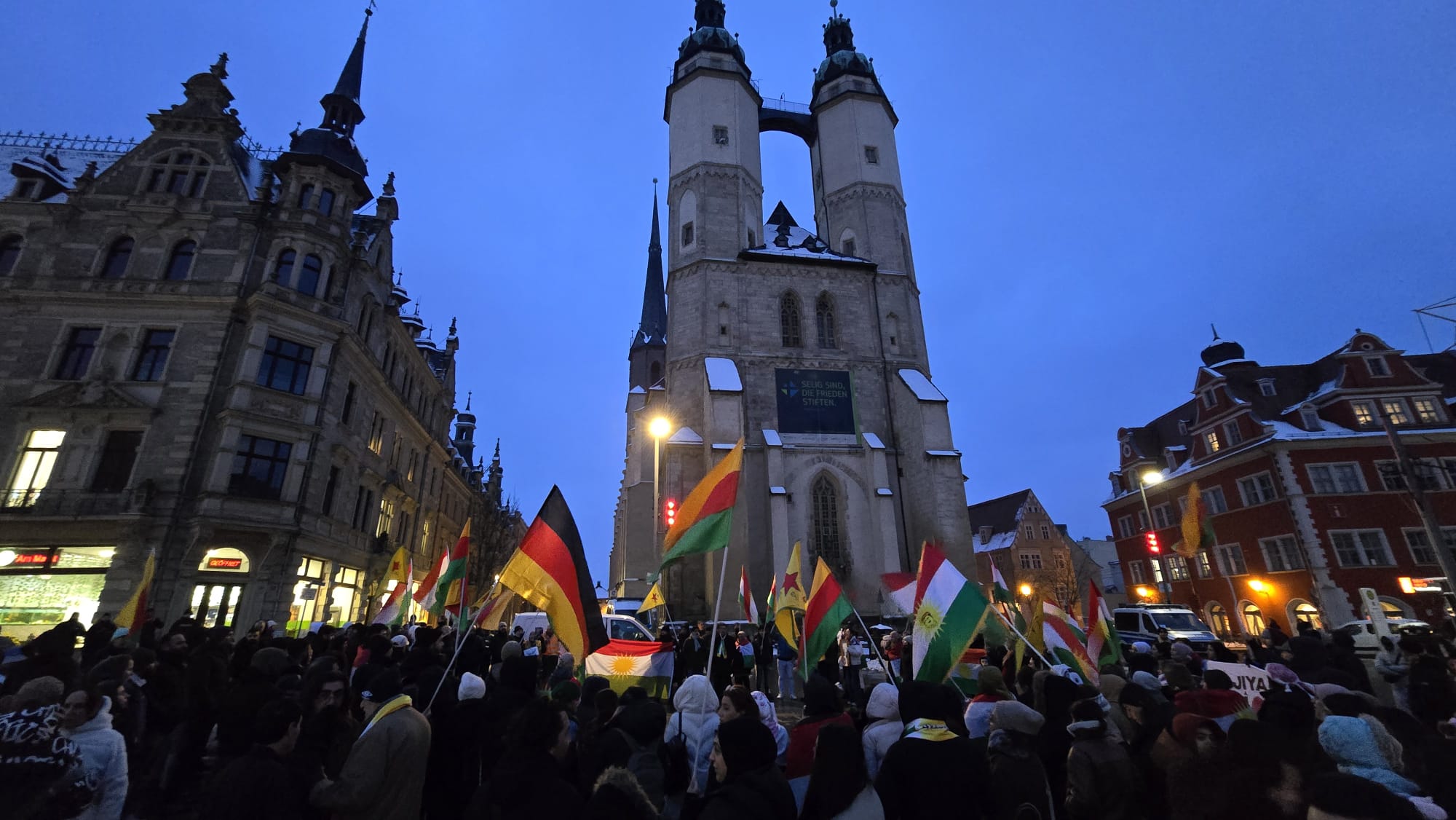 Seit Tagen gehen Kurden weltweit wegen Übergriffen in ihrer Heimatregion Rojava auf die Straße, so auch in Halle (Saale). Hier wurde diese Woche täglich eine Mahnwache auf dem Marktplatz abgehalten. Die Polizei war mit zahlreichen Einsatzkräften vor Ort. Denn nach Vorfällen am Montag und Dienstag mussten die Beamten auch am Mittwoch tätig werden.