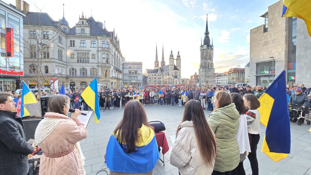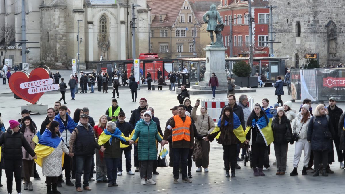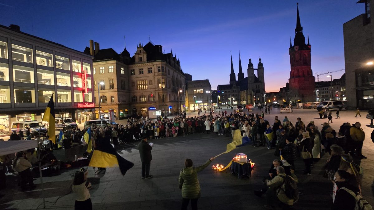 Rund 300 Menschen haben sich am Dienstagabend auf dem Marktplatz in Halle (Saale) versammelt, um an den Beginn des russischen Angriffskriegs gegen die Ukraine vor vier Jahren zu erinnern. Zwischen Stadtkirche und Rotem Turm wehten blau-gelbe Fahnen im kalten Februarwind, immer wieder hallte der Ruf „Slava Ukraini“ – Ruhm der Ukraine – über den Platz. Viele Demonstrierende hatten sich in ukrainische Flaggen gehüllt, andere trugen Kerzen oder selbstgemalte Plakate.