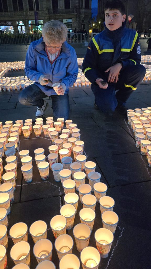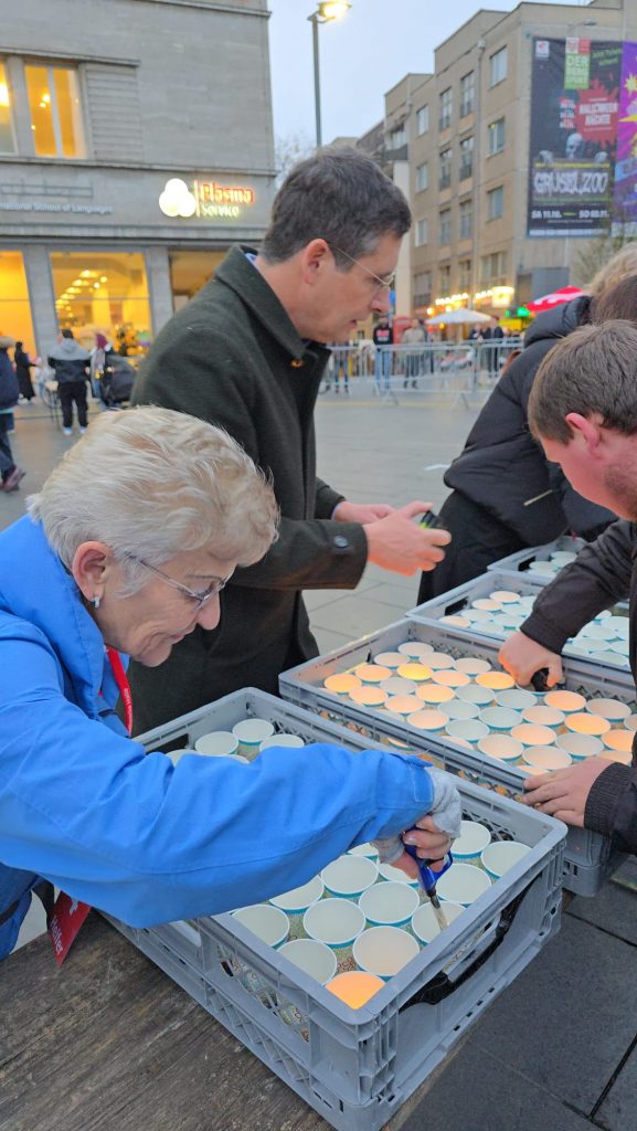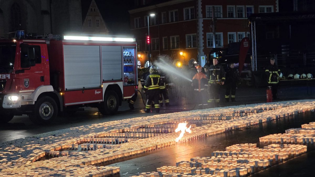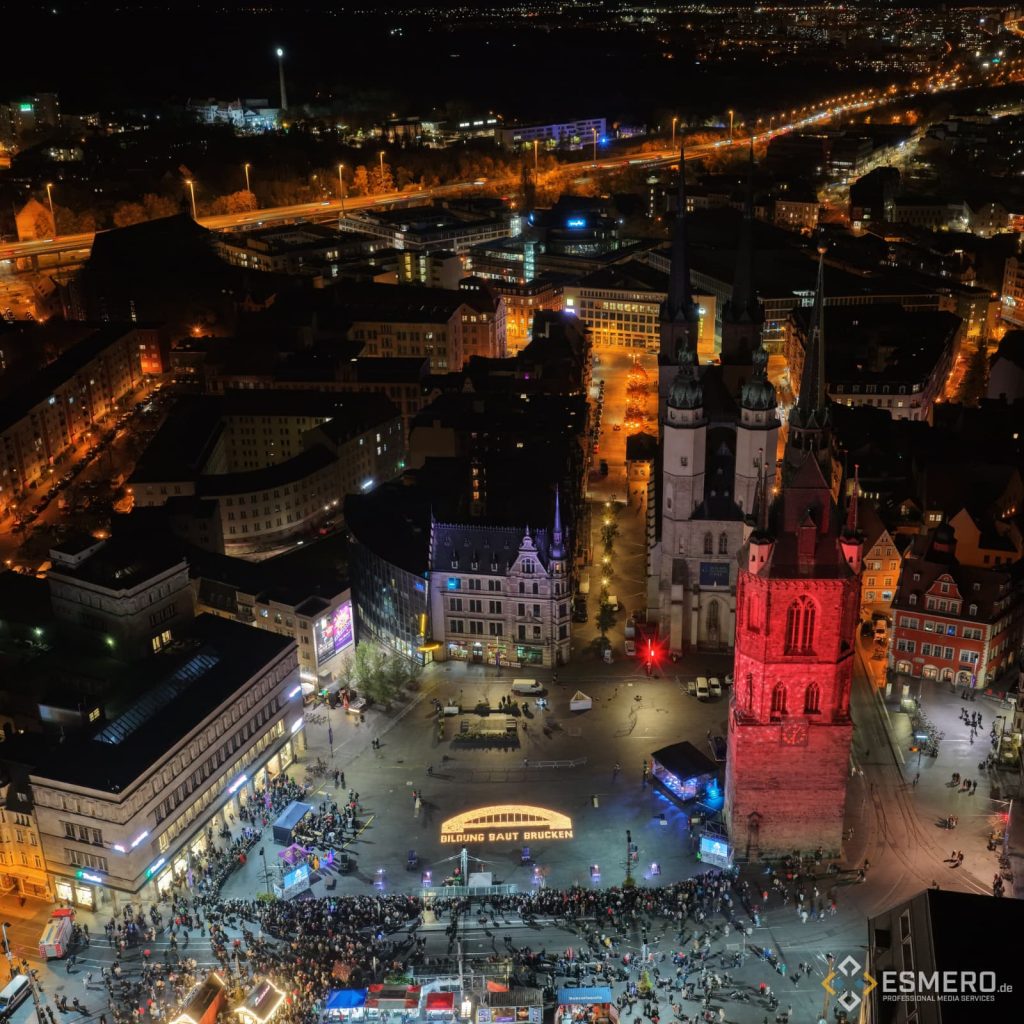 Der absolute Höhepunkt der Festtage stand am Sonntag an und bewies eindrucksvoll, was bürgerschaftliches Engagement leisten kann: die Erschaffung der Lichterskulptur. Rund 80 ehrenamtliche Helfer waren dafür im Einsatz. Neben dem Lions-Club engagierten sich unter anderem die THW-Jugend sowie die Freiwilligen Feuerwehren aus Lettin und Ammendorf. Gemeinsam gestalteten sie aus rund 12.000 Teelichtern ein beeindruckendes Lichtkunstwerk auf dem Marktplatz. Zu sehen war eine kunstvoll arrangierte Brücke, unter der der Schriftzug „Bildung baut Brücken“ leuchtete. Es ist das Leitmotiv des Lions-Clubs, wie Clubpräsident Andreas Lange erläuterte. Lange zeigte sich hochzufrieden, dass die filigrane Installation diesmal so lange ungestört bewundert werden konnte. „Wir standen hier auch schon bei Regen und Sturm“, erinnerte er sich, als das fertige Ergebnis nur wenige Minuten zu sehen war. Diesmal jedoch störten weder Wind noch Regen die friedlich flackernden Flammen. Die Aktion ist nicht nur ein optischer Genuss, sondern dient auch einem guten Zweck: Der gesamte Erlös kommt Bildungsprojekten in Halle zugute. Sponsoren hatten vorab die Lichter gekauft und damit das Projekt finanziell unterstützt. Allein im letzten Jahr kamen auf diese Weise rund 4.500 Euro zusammen. Davon profitierten unter anderem das Salinetechnikum und verschiedene Schulen in der Stadt.