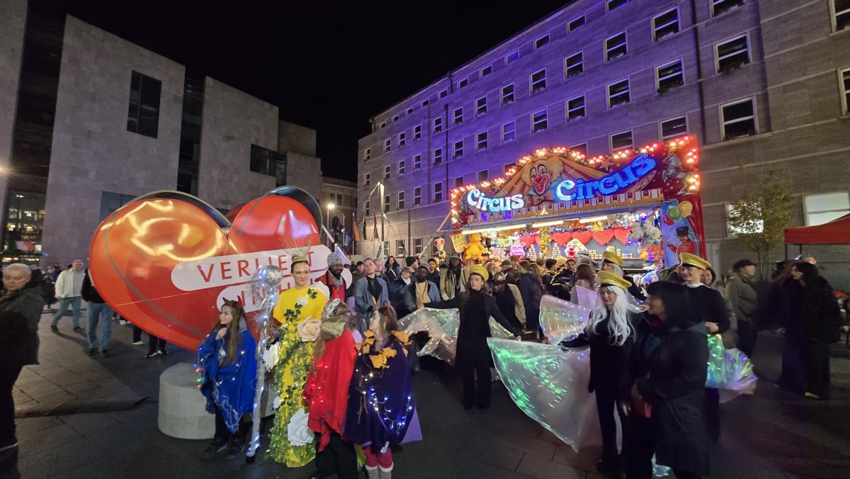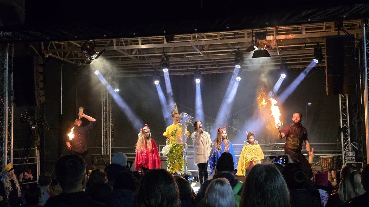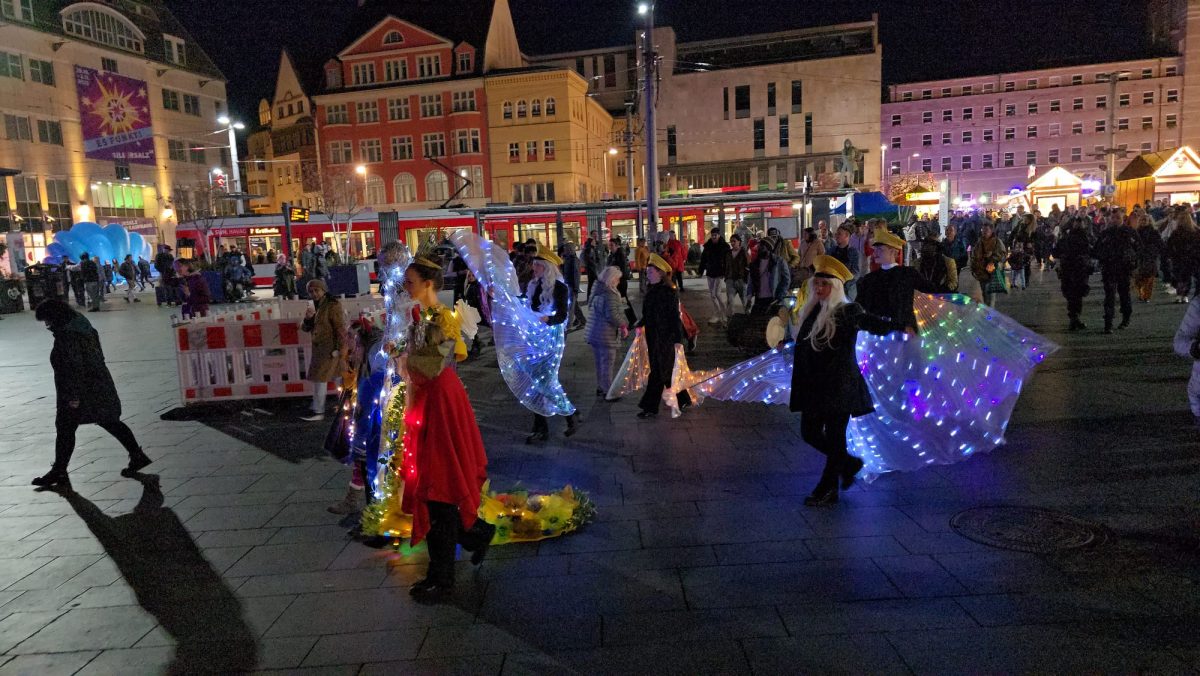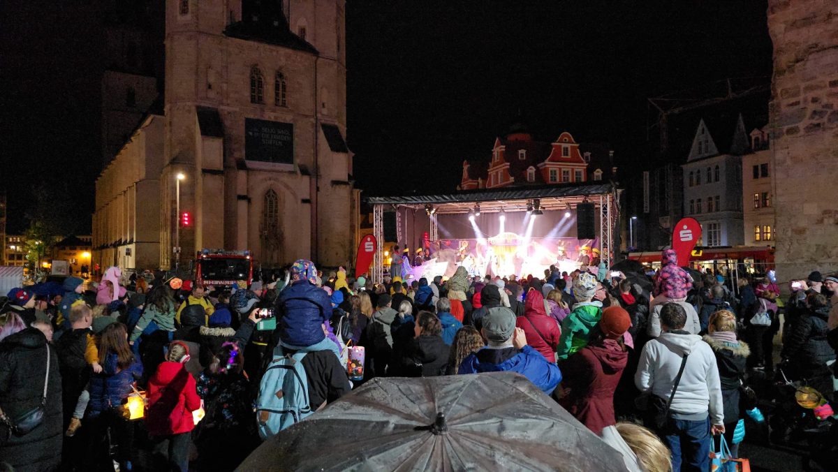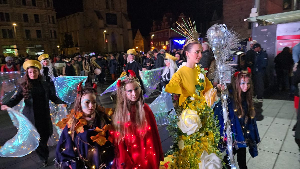 Freitagabend wurde die Lichterfee Linda I. gekrönt. Der traditionelle Laternenumzug am Samstagabend musste sich dann den Launen des Wetters beugen. Kräftige Regenfälle setzten dem Zug zu, weshalb deutlich weniger Teilnehmer als in den Vorjahren mit ihren leuchtenden Lampions unterwegs waren. Zuvor wurde durch die Lichterfee die neue Beleuchtung der Kuppelhalle im Hauptbahnhof in Betrieb genommen. Von dort aus ging es für alle Laternenhalter, ausgerüstet mit Schirmen, zum Marktplatz. Mit leuchtenden Lampions reihten sich auch Oberbürgermeister Dr. Alexander Vogt und Sparkassen-Chef Jürgen Fox in den Umzug ein – ein sichtbares Zeichen der Unterstützung aus Politik und Wirtschaft. Auf dem Marktplatz angekommen, erwartete die Besucher ein familiäres Programm. Eine Gute-Nacht-Geschichte stimmte auf die Nacht ein, bevor der obligatorische „Sternenstaub“ – ins Publikum geworfene Süßigkeiten – für Jubel bei den kleinen Gästen sorgte. Den feierlichen Abschluss des ersten Abends bildete eine viertelstündige Lasershow.
