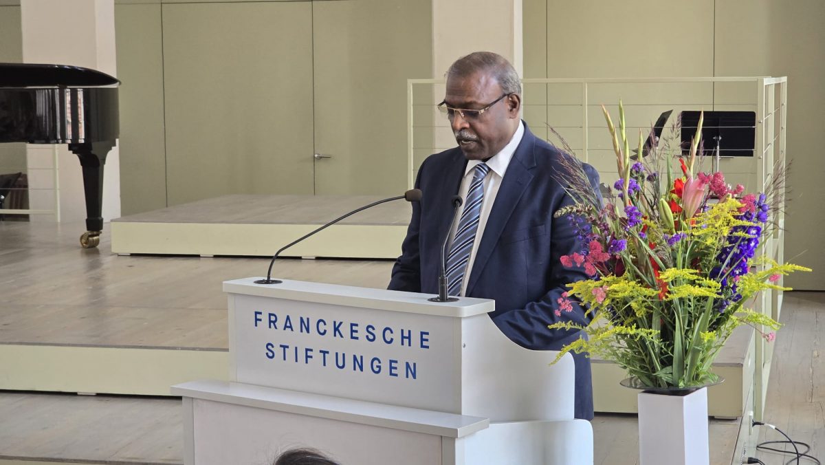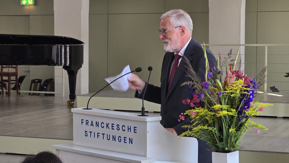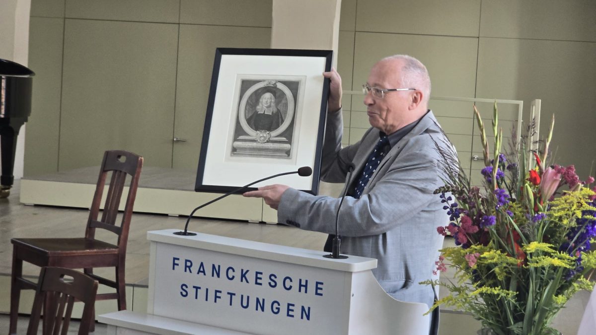 Den Festvortrag hielt der indische Theologe Daniel Jeyaraij, der eindrucksvoll die Geschichte seiner eigenen Verbindung zu Halle und den Stiftungen erzählte. Seine Forschung über die Ursprünge des Christentums in Tamil Nadu führte ihn nach Halle – in eine Stadt, die er zunächst als fremd und schwierig erlebte. Doch mit der Zeit wurde sie für ihn ein Zuhause. Besonders bewegte ihn, dass sein eigenes Kulturerbe hier seit Jahrhunderten gepflegt und bewahrt werde.