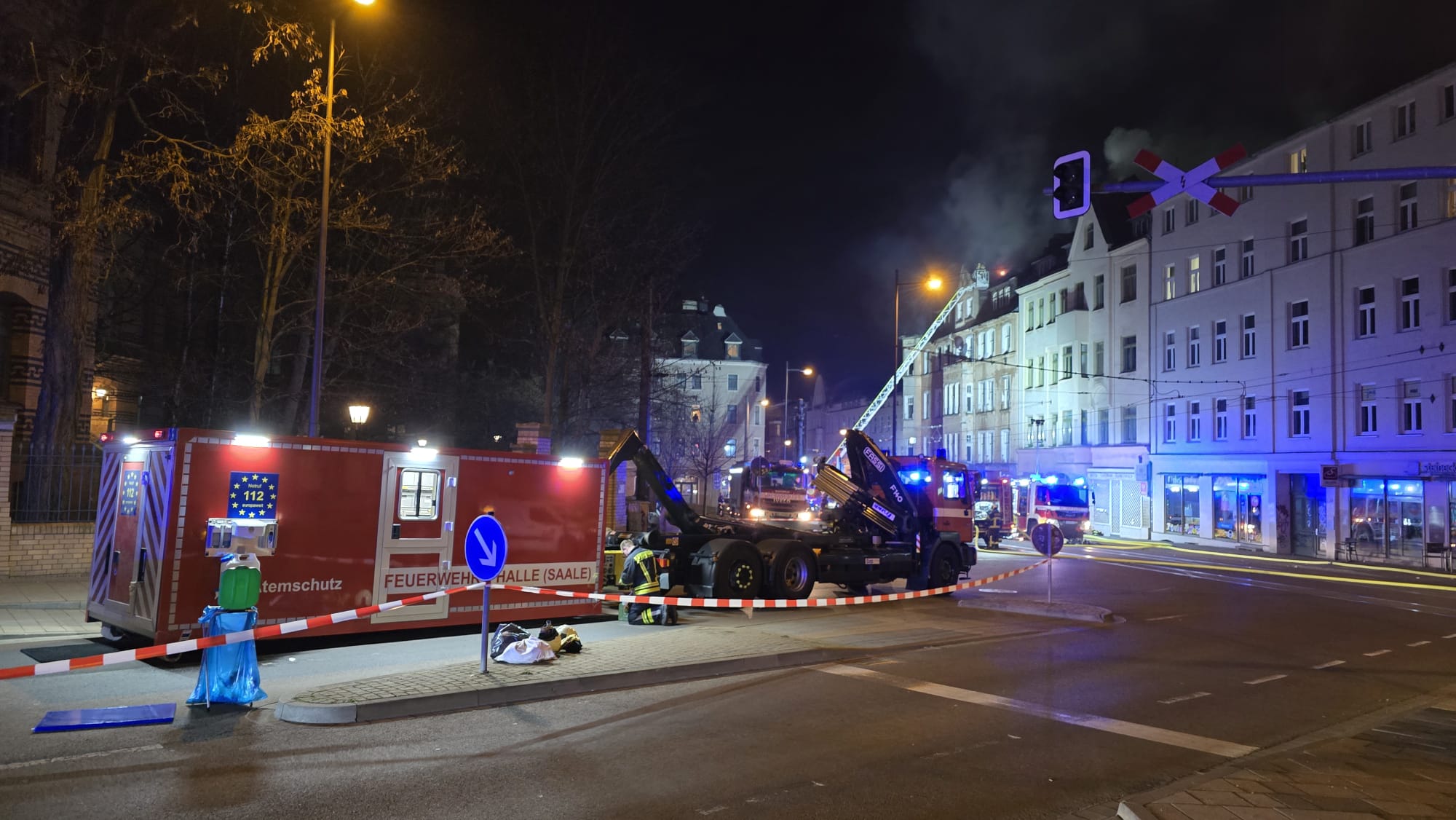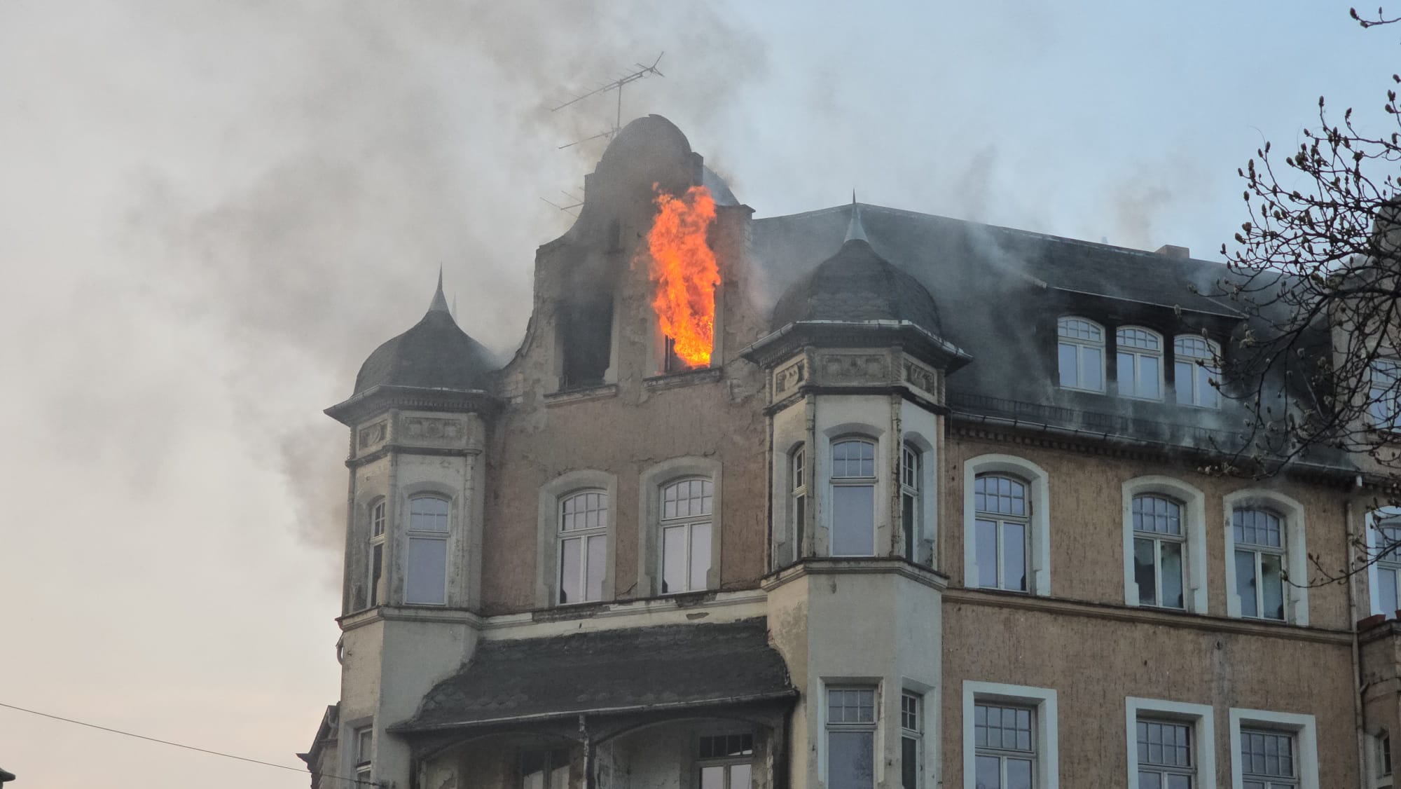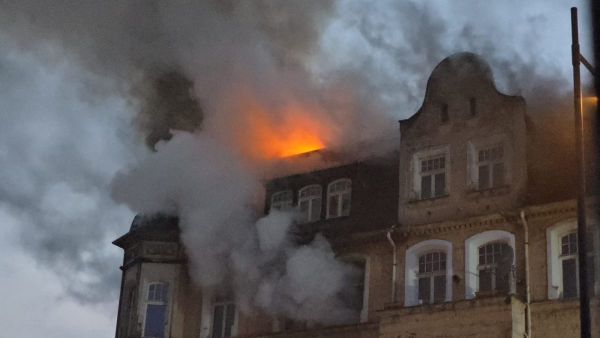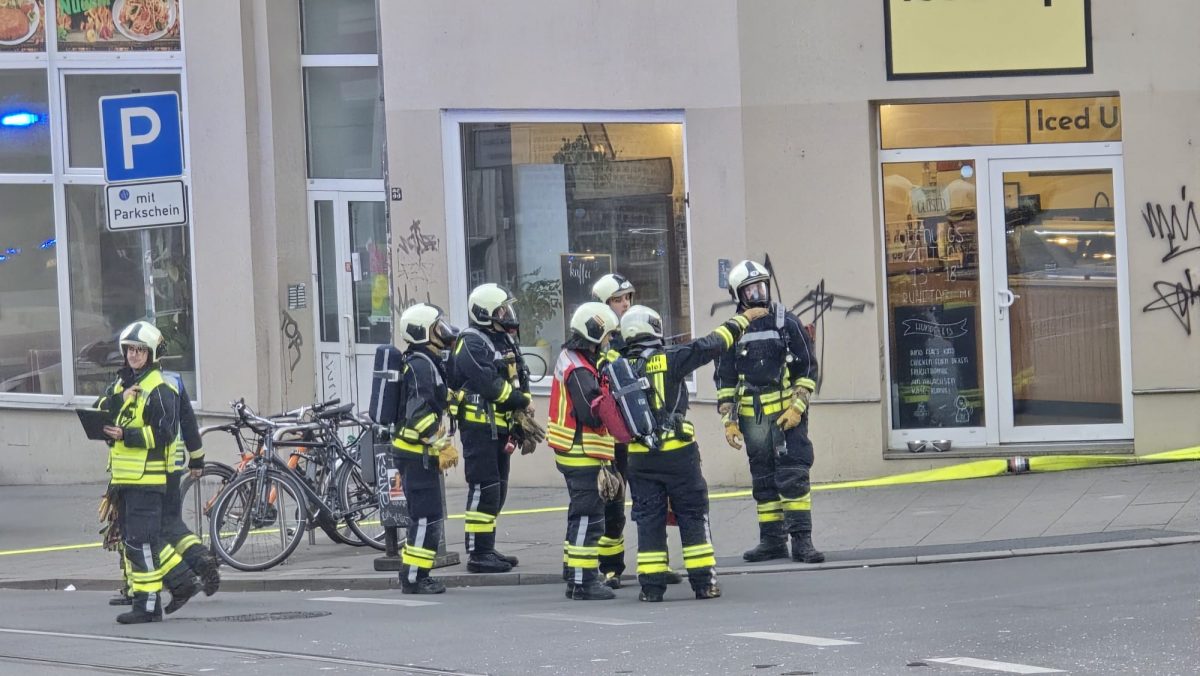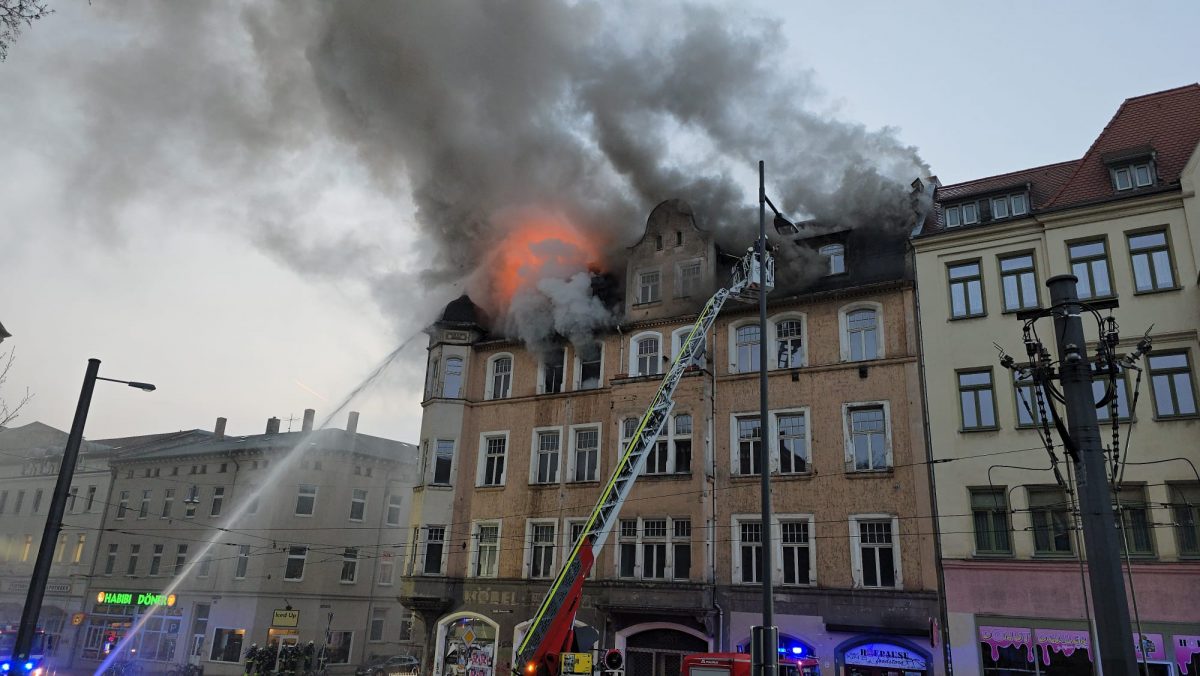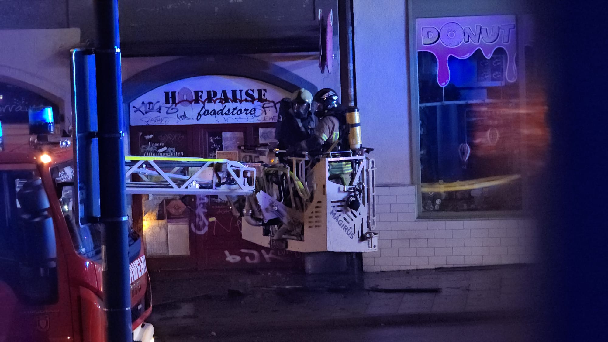 Gegen 18 Uhr am Dienstagabend drangen Rauchwolken aus einem Gebäude in der Großen Steinstraße Ecke Ludwig-Stur-Straße, Trümmerteile der Fassade und von zerborstenen Fensterscheiben stürzten nach unten.