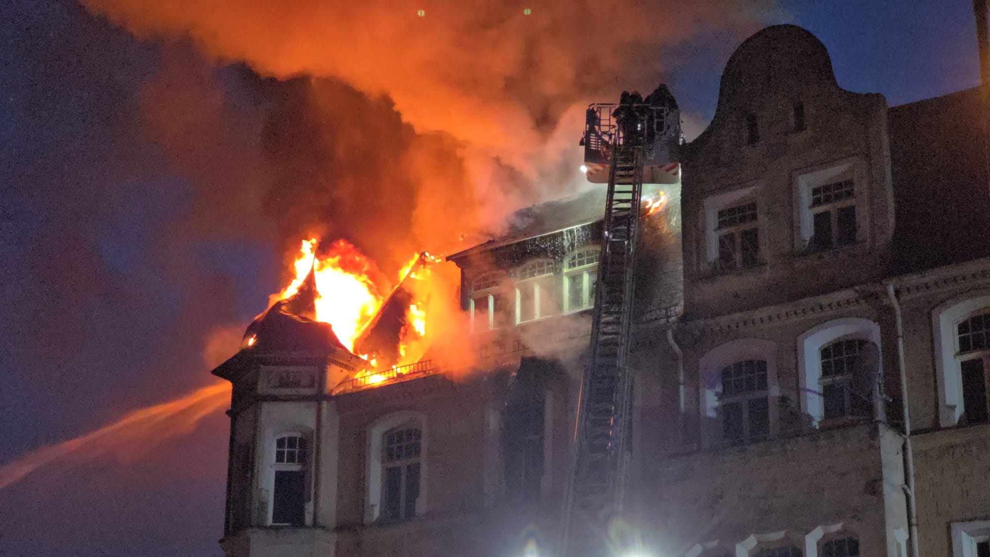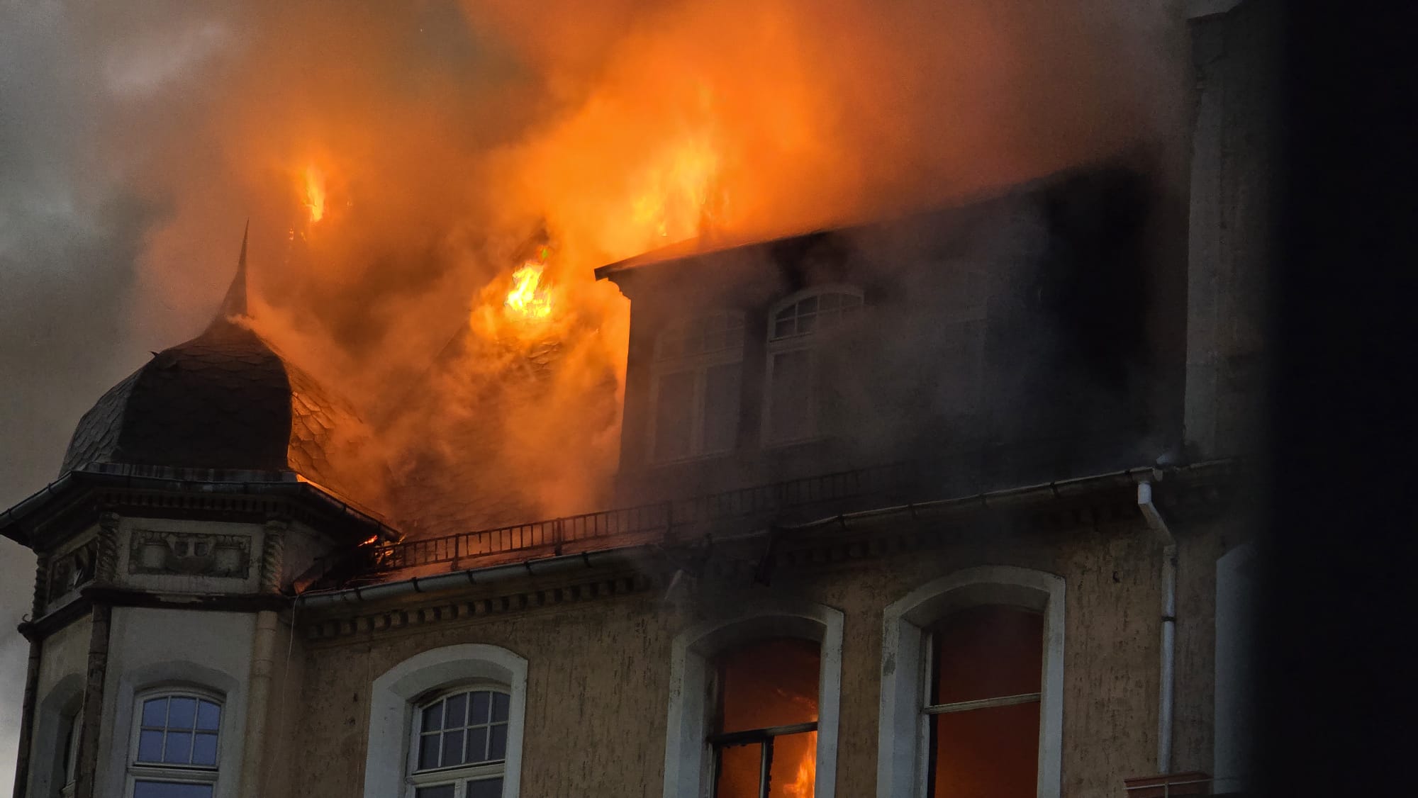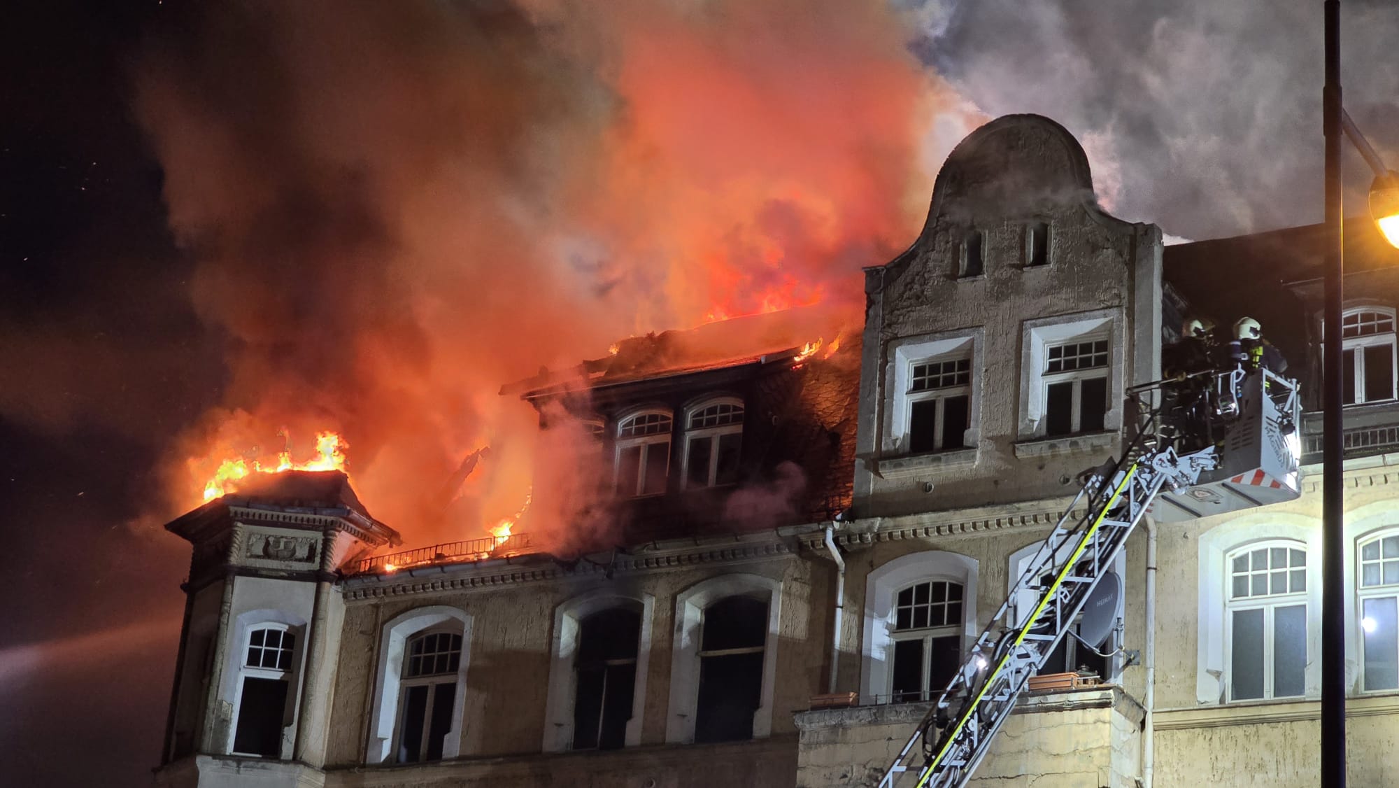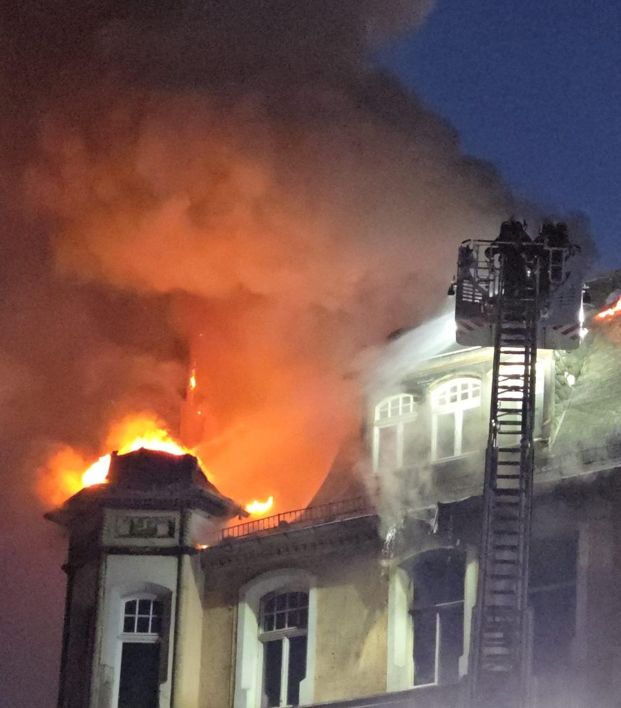 Als die Feuerwehr kurze Zeit später eintraf, waren bereits Flammen in dem Eckhaus, in dem sich ehemals „Möbel Kunert“ befand, sichtbar. Im Laufe des Abends breitete sich das Feuer auf den gesamten Dachstuhl aus. Die Feuerwehr war unter anderem mit zwei Drehleitern vor Ort. Dabei galt zunächst das Hauptaugenmerk darauf, dass die Flammen nicht die benachbarten Häuser erfassen.