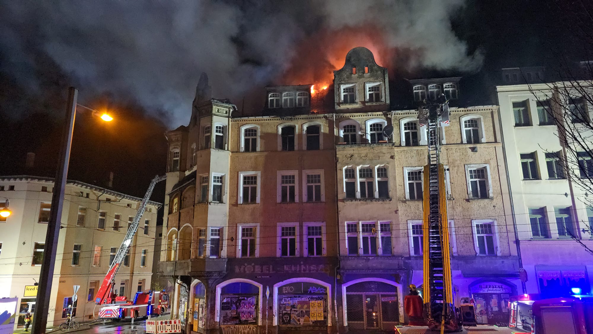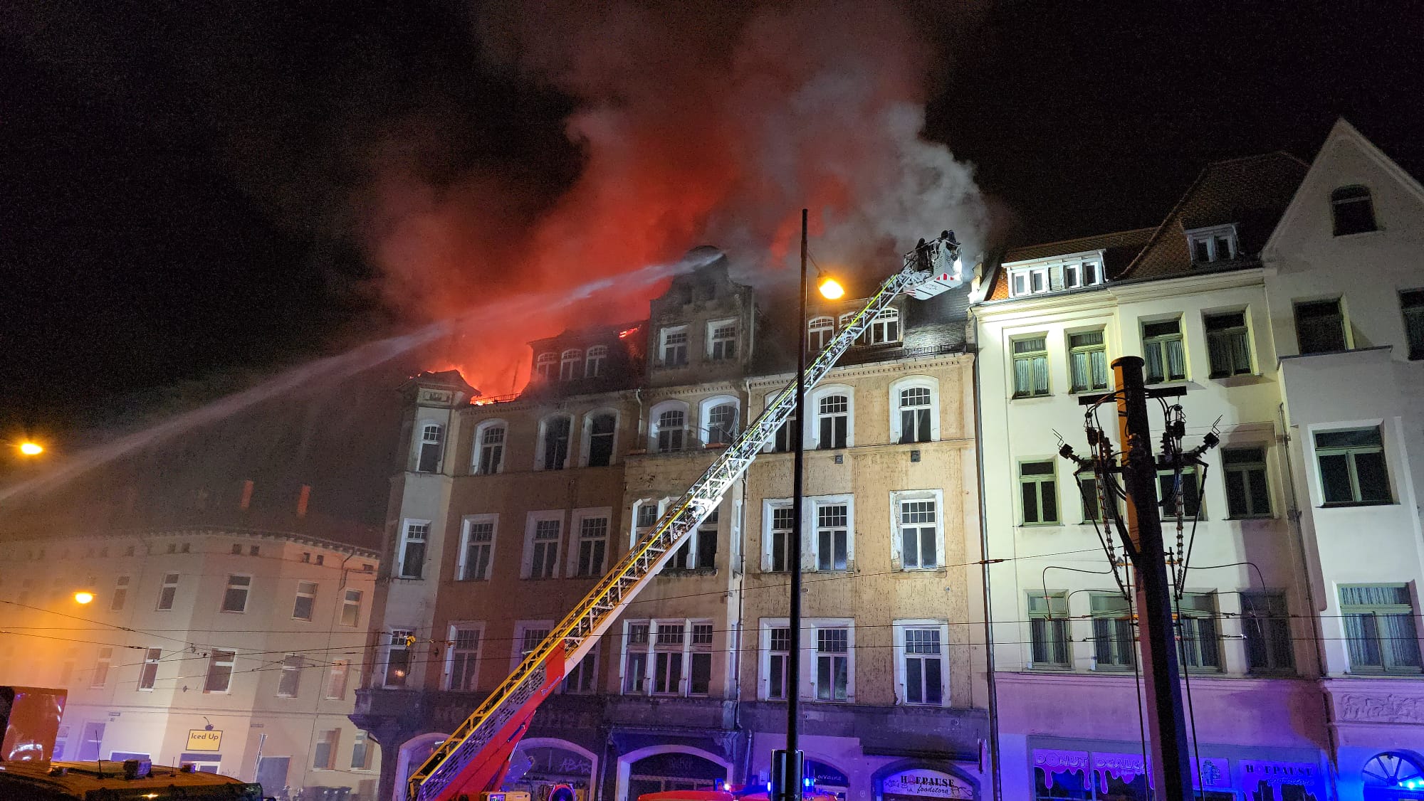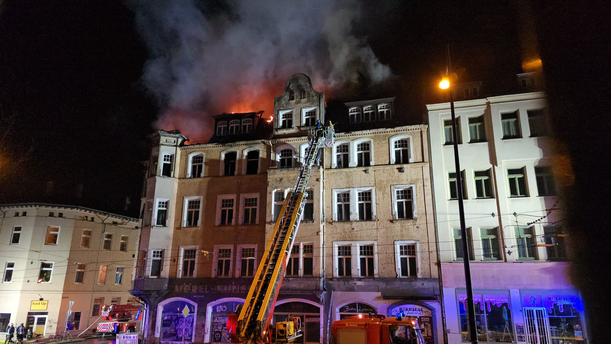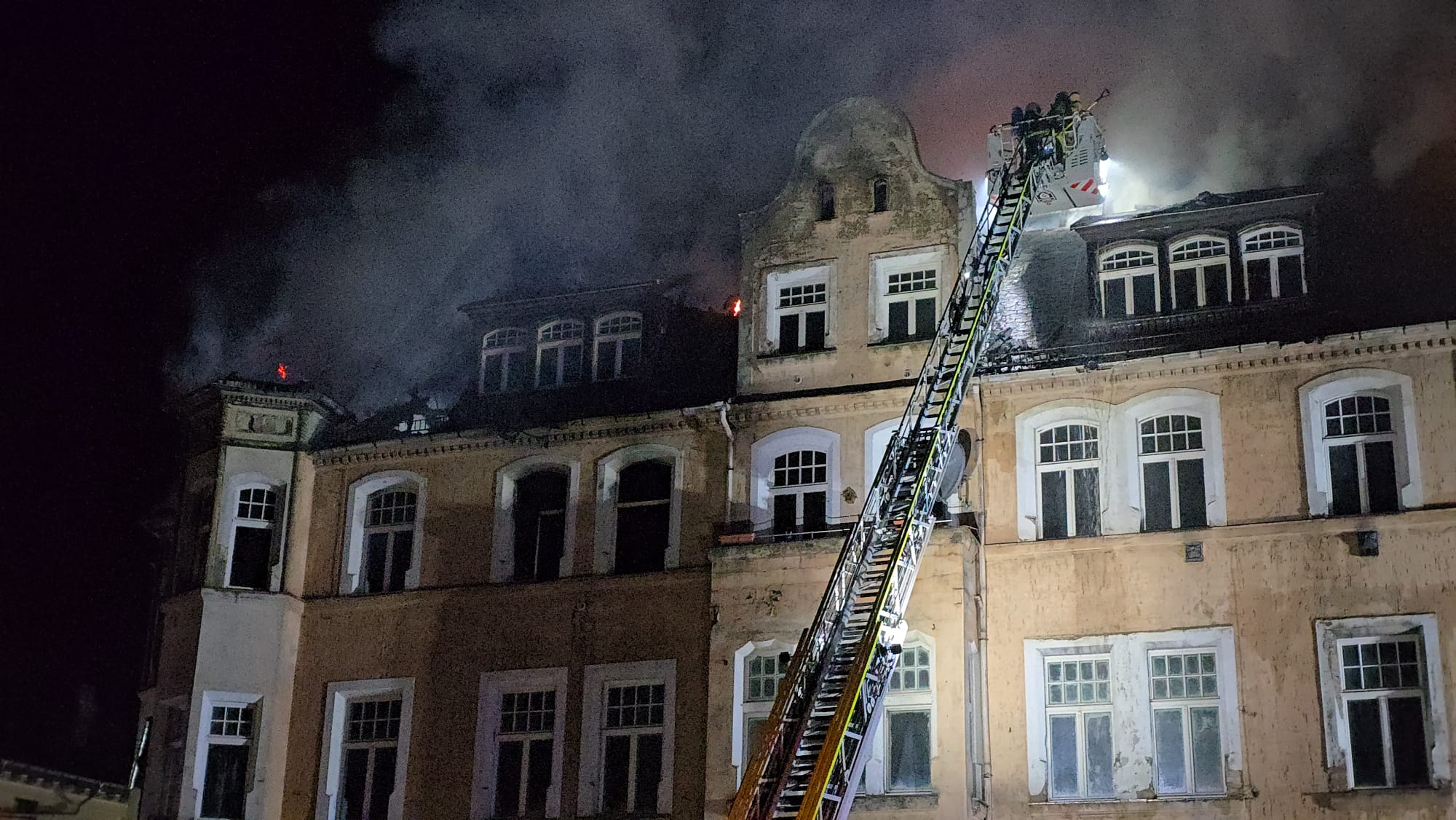 Als die Feuerwehr kurze Zeit später eintraf, waren bereits Flammen in dem Eckhaus, in dem sich ehemals „Möbel Kunert“ befand, sichtbar. Im Laufe des Abends breitete sich das Feuer auf den gesamten Dachstuhl aus. Die Feuerwehr war unter anderem mit zwei Drehleitern vor Ort. Dabei galt zunächst das Hauptaugenmerk darauf, dass die Flammen nicht die benachbarten Häuser erfassen.