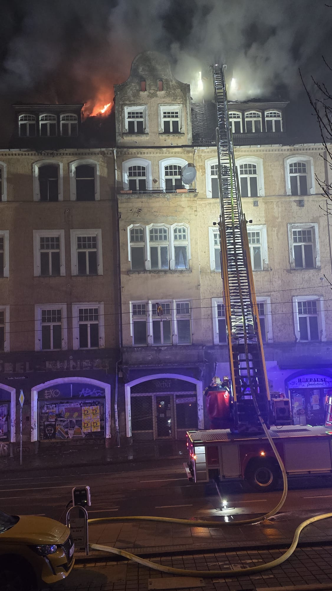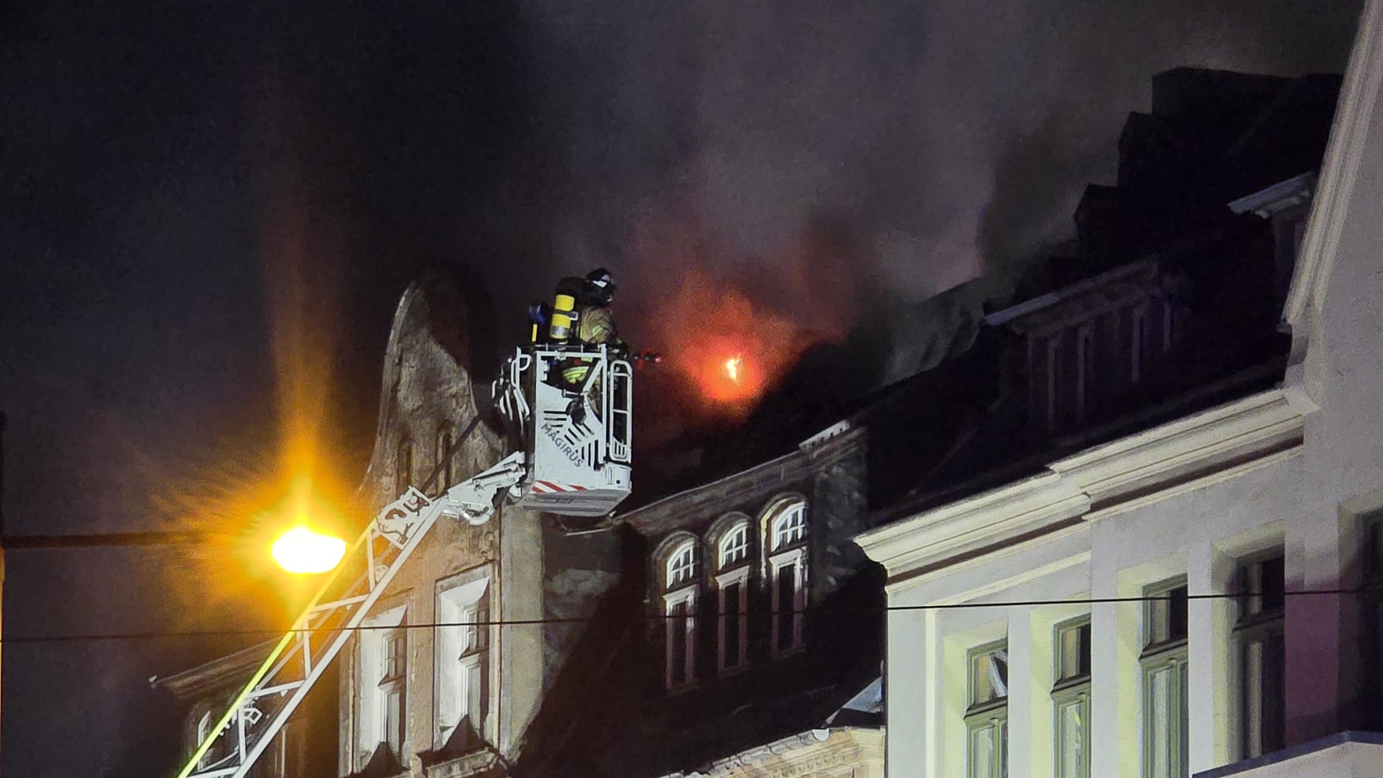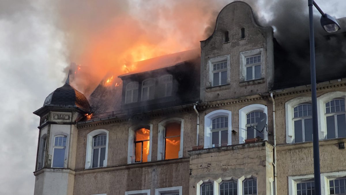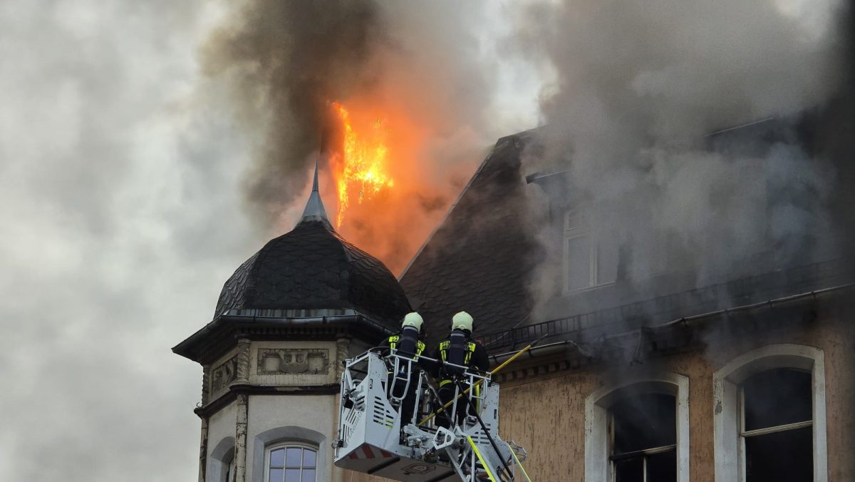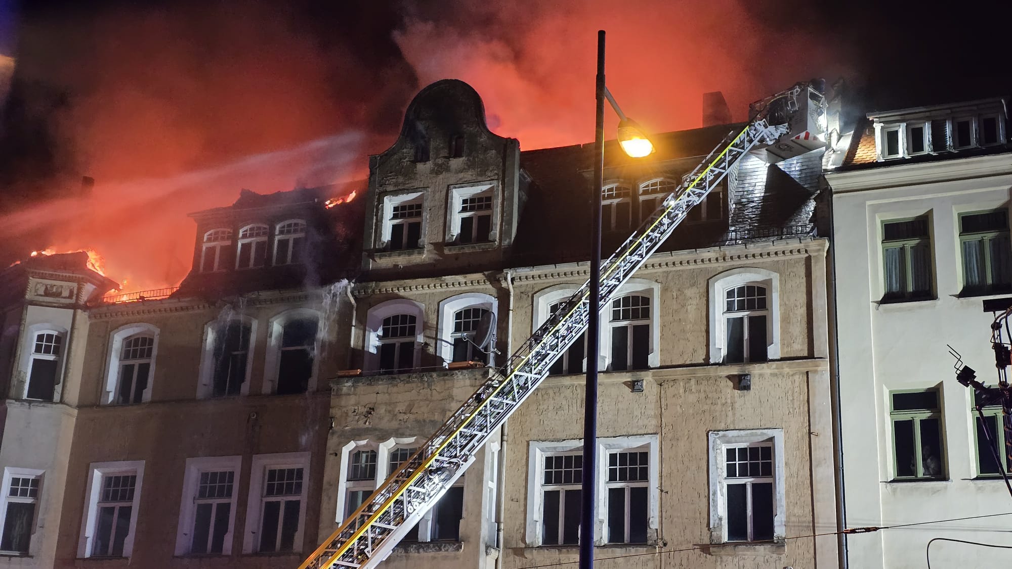 Als die Feuerwehr kurze Zeit später eintraf, waren bereits Flammen in dem Eckhaus, in dem sich ehemals „Möbel Kunert“ befand, sichtbar. Im Laufe des Abends breitete sich das Feuer auf den gesamten Dachstuhl aus. Die Feuerwehr war unter anderem mit zwei Drehleitern vor Ort. Dabei galt zunächst das Hauptaugenmerk darauf, dass die Flammen nicht die benachbarten Häuser erfassen.
