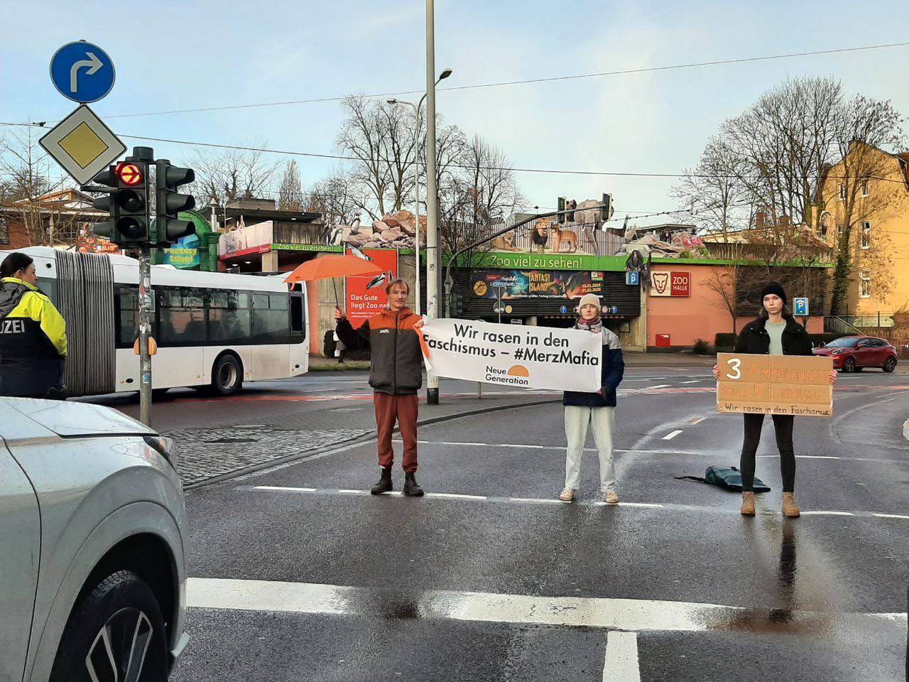 „Das Gute liegt Zoo nah“ ist die Werbung des Zoos im Hintergrund und kein Transpi. Der Beta-Typ hält nen Regenschirm. Und ne 40er-Zone gibt es nicht… 😉