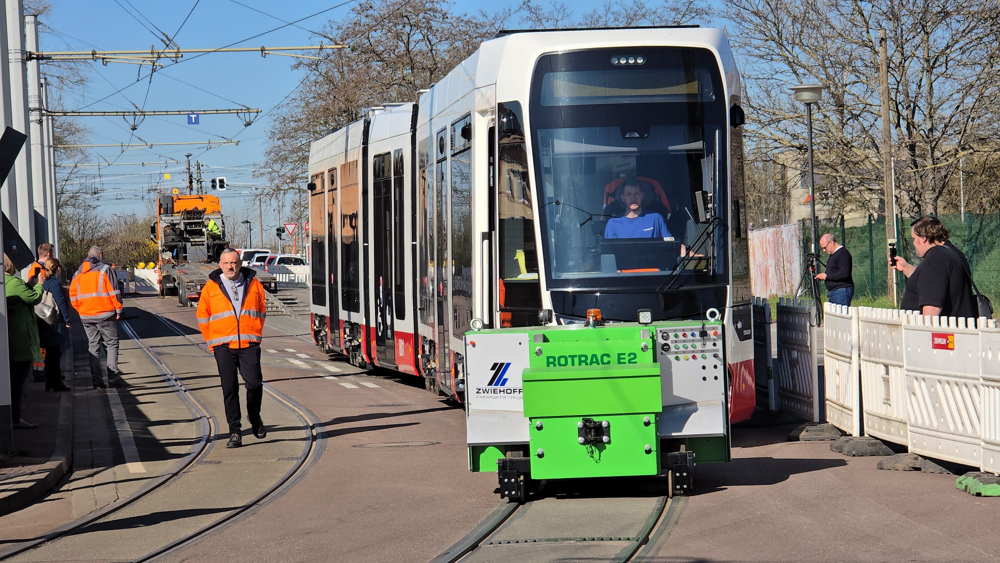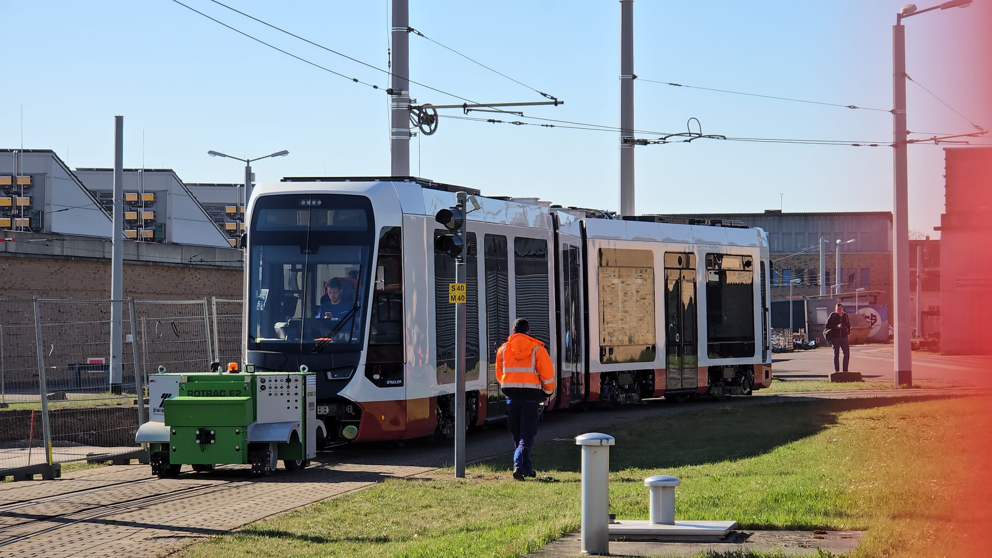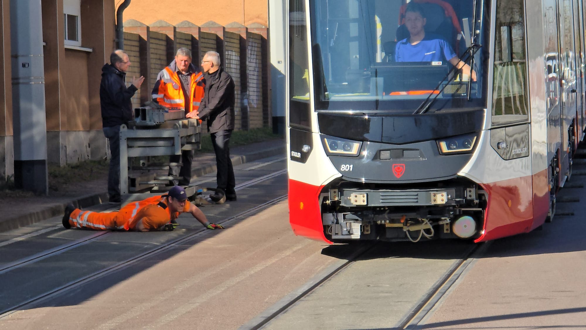 Die kurze Bahn ist aber nur eine Ausnahme. Die nächsten 14 Bahnen werden alle die XL-Variante mit 45 Metern Länge sein. “Wir wollen erstmal alle Langen da haben.” Die jetzige Kurbahn sei vor allem für die technischen Abnahmefahrten wichtig. Bevor die neuen Fahrzeuge in den Linieneinsatz mit Fahrgästen gehen, werden die Fahrzeuge einer sogenannten Typenprüfung unterzogen und es werden Streckenbefahrungen durchgeführt. Sowohl Fahrbedienstete, Werkstattmitarbeitende und auch Rettungskräfte werden für das Neufahrzeug TINA „fit“ gemacht und erhalten teilweise umfangreiche Schulungen. Dies umfasst die Bedienung, Behebung von Störungen, aber auch Wartung und Instandsetzung. Die Fahrbediensteten werden durch die HAVAG-Fahrschule geschult und eingewiesen. Dies umfasst die Bedienung des Fahrzeugs, das Erkennen von Störungen und Fehlern sowie deren Behebung. Bei erfolgreichem Abschluss dürfen die Fahrbediensteten dann die TINA-Fahrzeuge fahren. Chefausbilder Thomas Lipski und Werkstattleiter Sören Jandt saßen laut Schwarz bereits am Steuer, zudem die Stadler-Mitarbeiter, die derzeit ständig vor Ort sind.