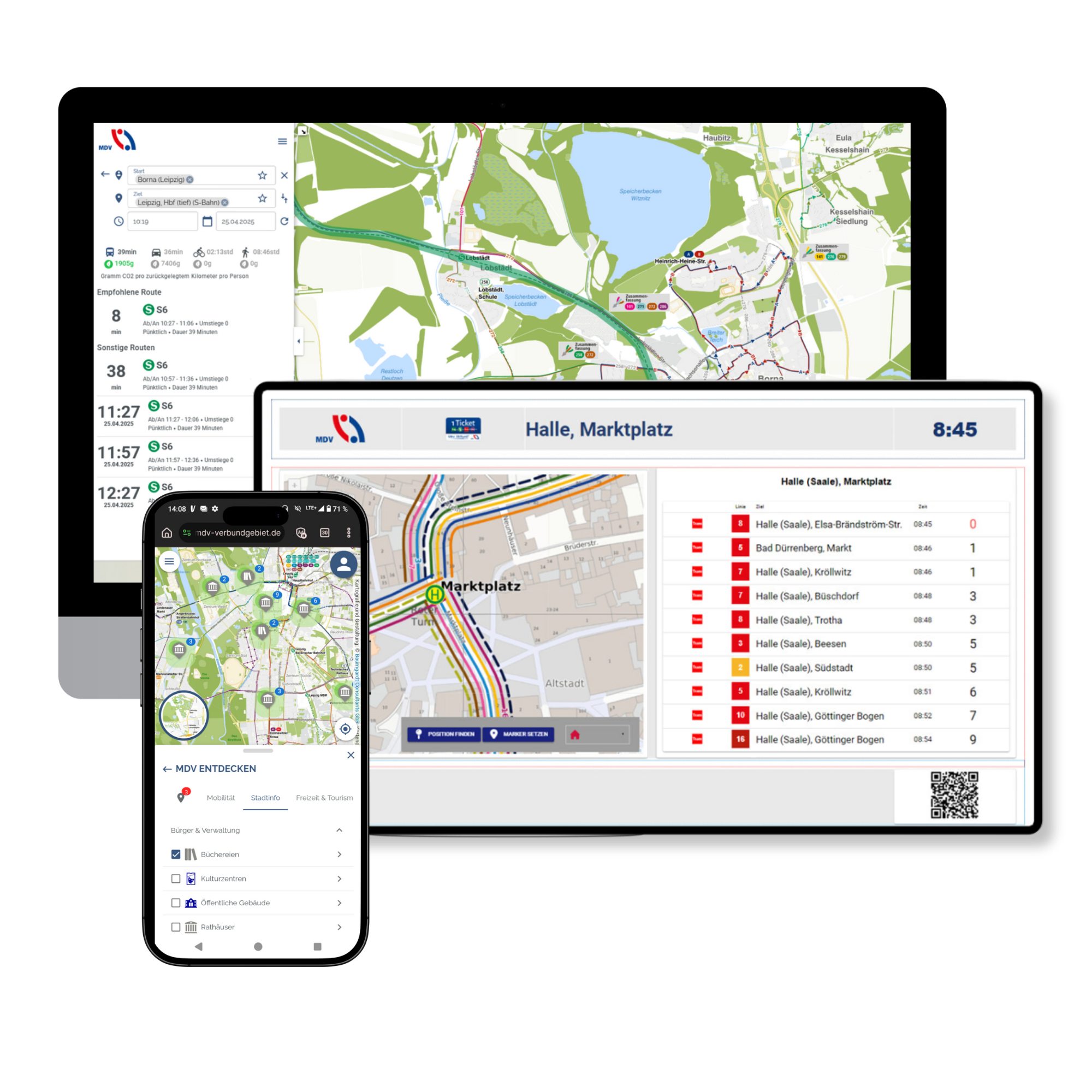 Eine neue digitale Plattform erleichtert die Orientierung im Verbundgebiet des Mitteldeutschen Verkehrsverbundes: das interaktive Liniennetz. Die digitale Anwendung ist am Desktop, dem Tablet oder Smartphone nutzbar und liefert Echtzeitinformationen zu Fahrplänen und Linienverläufen. Durch verschiedene Schnittstellen ist das interaktive Liniennetz zudem mit einer Vielzahl von Auskünften zu Sehenswürdigkeiten, RufBus-Gebieten und Ausflugszielen gefüttert. Das Besondere daran: Alle Informationen sind eingebettet in eine detaillierte topografische Karte und erleichtern durch die direkte Visualisierung von Haltestellen und Laufwegen die räumliche Orientierung im ÖPNV.