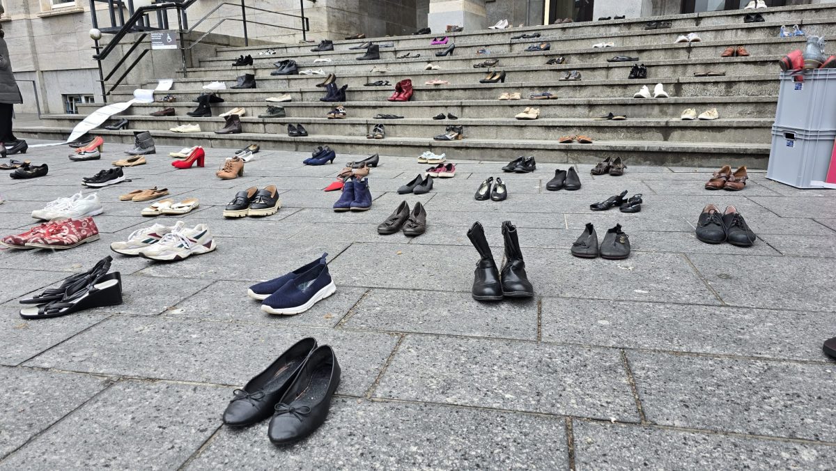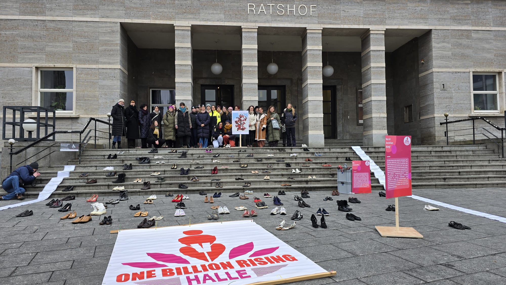One Billion Rising in Halle (Saale): Schuhe am Ratshof erinnern an die Femizid-Opfer das vergangenen Jahres