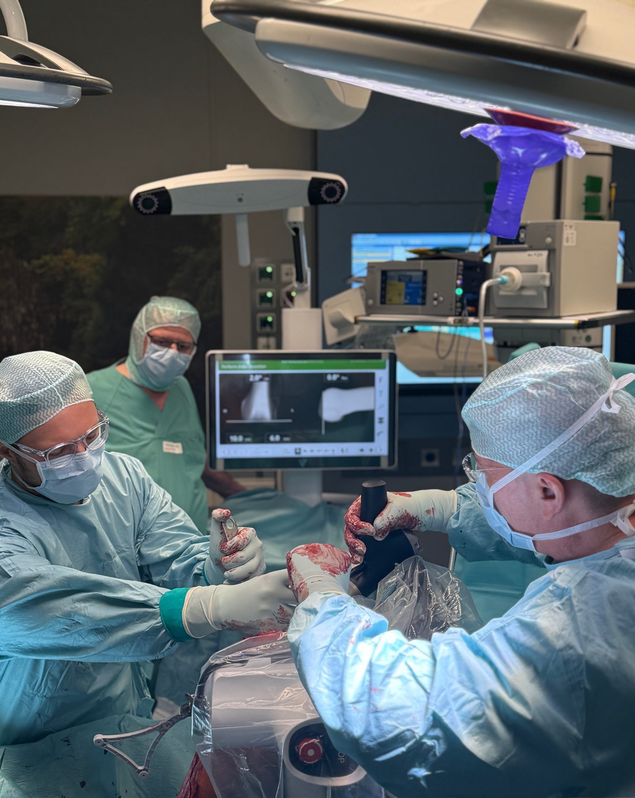 Das System erstellt unter der OP ein 3D-Modell des Kniegelenks mit patientenindividuellen Daten und errechnet auf dieser Grundlage die exakte Prothesengröße sowie die Platzierung der notwendigen Sägeschnitte. „Damit können wir die OP-Planung in der Endoprothetik weiter optimieren und präzisieren“, so Dr. Thomas Conrad. Anschließend ermöglicht eine robotisch unterstützte Säge hochpräzise Schnitte am Knochen und macht es möglich, die patientenindividuelle Planung vollständig umzusetzen. Der Chirurg, der die Säge führt, erhält in Echtzeit die Rückmeldung über die korrekte Einhaltung der Schnittlinien.