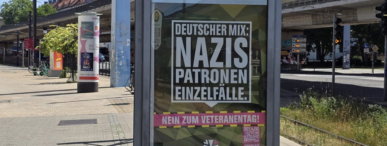 Am heutigen Sonntag findet zum ersten Mal der bundesweite Veteranentag in Deutschland statt – ein Gedenk- und Ehrentag, der ehemaligen Soldatinnen und Soldaten gewidmet ist. Doch während vielerorts Veranstaltungen, Empfänge und sogenannte „bürgerschaftliche Begegnungen“ … Plakataktion zum Veteranentag: Adbustings in Halle prangern Bundeswehr als „Braunes Heer“ an weiterlesen