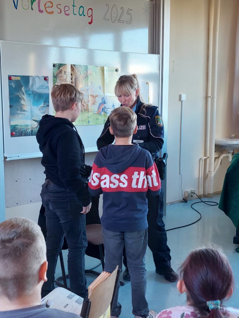 Polizei und Stadtrat Ferdinand Raabe lesen in der Heideschule vor