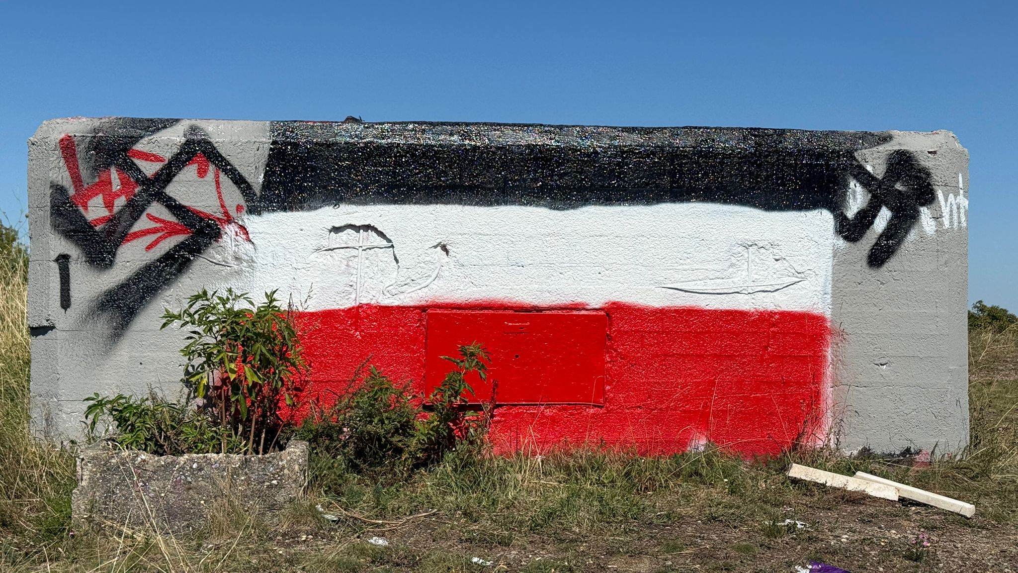 Zudem wurden daneben zwei Hakenkreuze mittels schwarzer Sprayfarbe aufgebracht.
