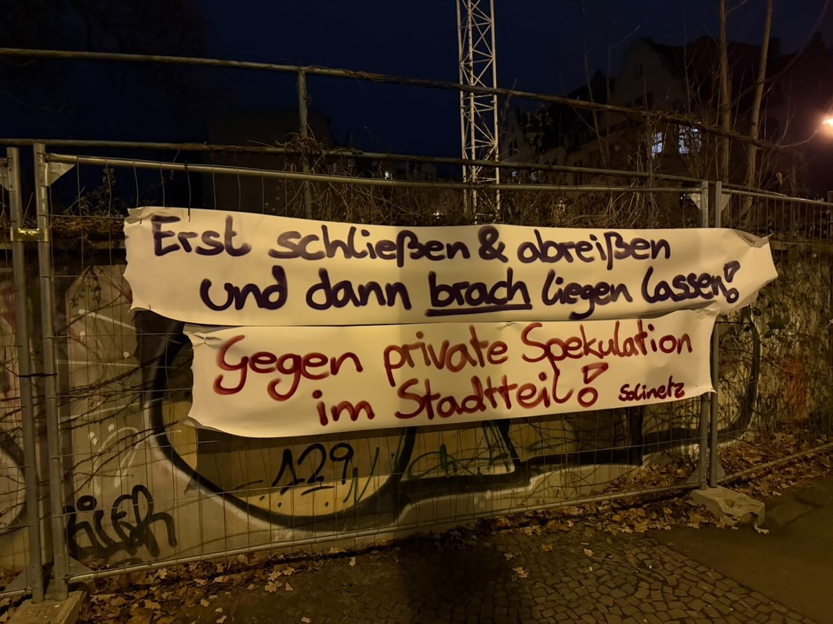 Protestplakat wegen Baustopp an der Schorre – Eigentümer hat bis November 2027 Zeit, weiterzumachen – sonst verfällt die Baugenehmigung
