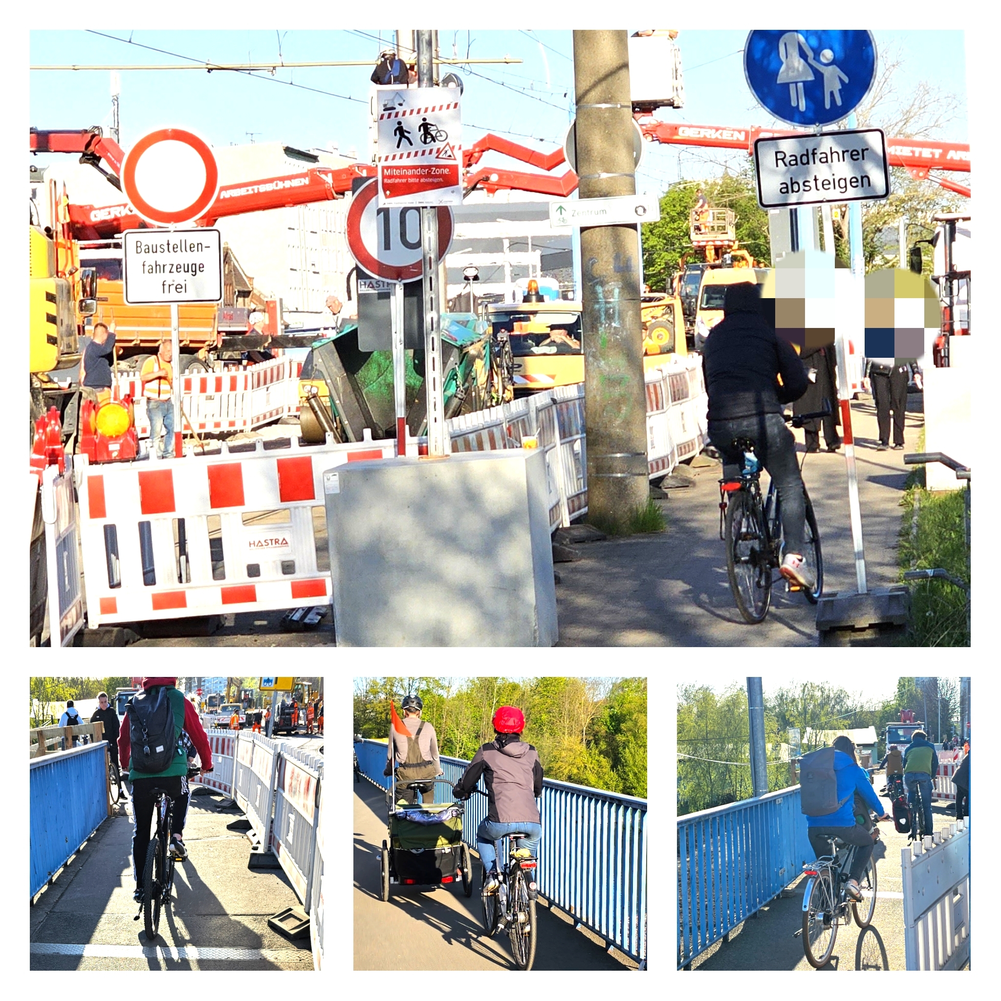 Dass man wieder mal Radfahrer und Fußgänger auf den selben Verkehrsraum schickt, hat ja leider Methode. Dass dadurch Konflikte vorgezeichnet sind, ist bestenfalls fahrlässig, vielleicht sogar beabsichtigt. Aber Radfahrer sind bei Baustellen sowieso immer am meisten benachteiligt.