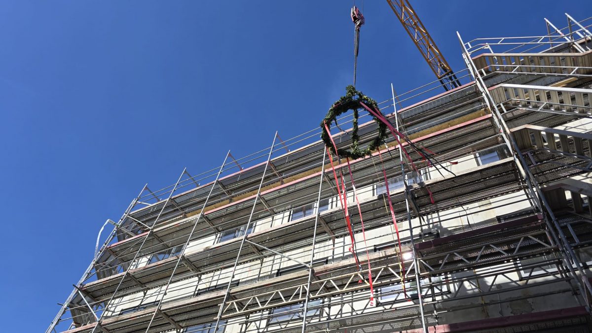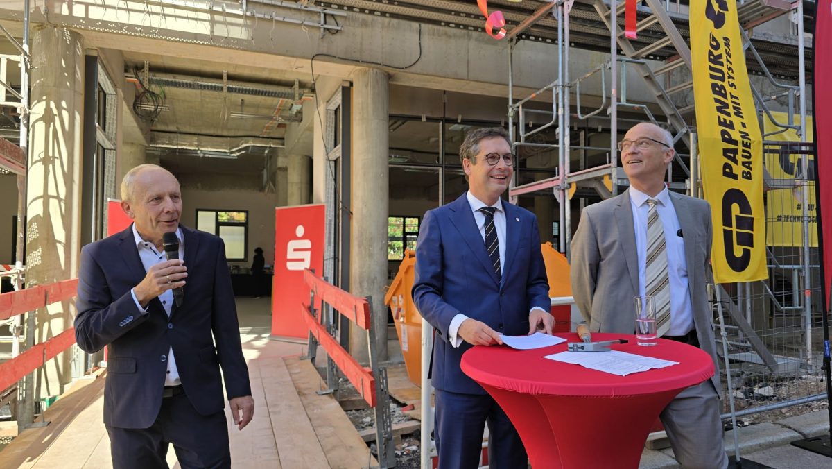 Vor dem Baustart mussten 3.000 Tonnen Porphyrfels abgetragen und 100 Bohrpfähle in den Untergrund gesetzt werden – eine Herausforderung, die der Niederlassungsleiter der GP Papenburg Hochbau GmbH, Stefan Brunsch, beim Richtfest mit Blick auf die schwierige Hanglage noch einmal hervorhob. Zuvor hatte es auch Proteste gegen die Fällung von 27 Bäumen gegeben, was das Projekt zeitweise in die öffentliche Diskussion rückte. Heute jedoch, so der Tenor beim Richtfest, wird der Standort als ideal angesehen.