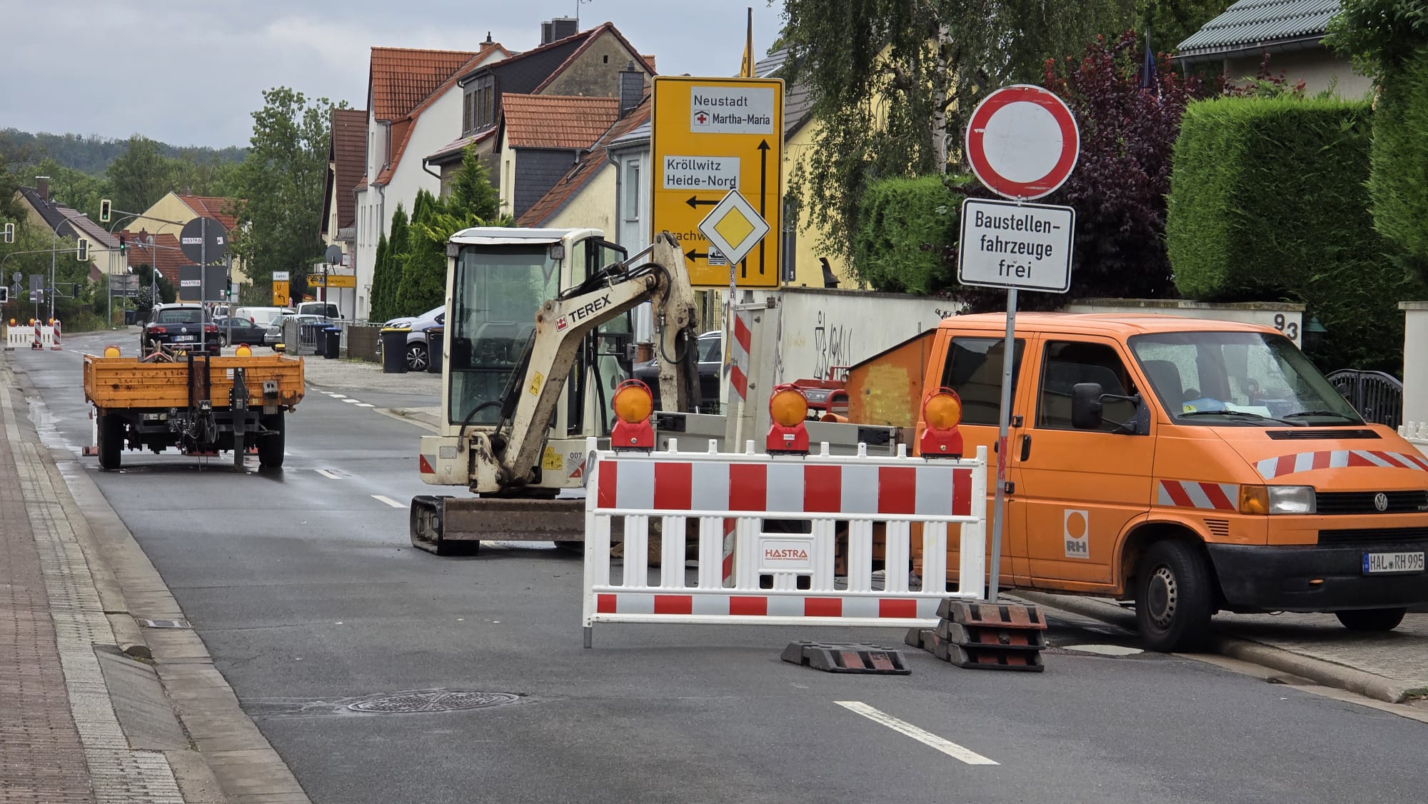 In Halle Dölau ist die Salzmünder Straße zwischen Neuragoczystraße und Am Sonnenhang gesperrt. Hier muss die Fahrbahn nach einem Leitungsschaden aufgerissen werden.