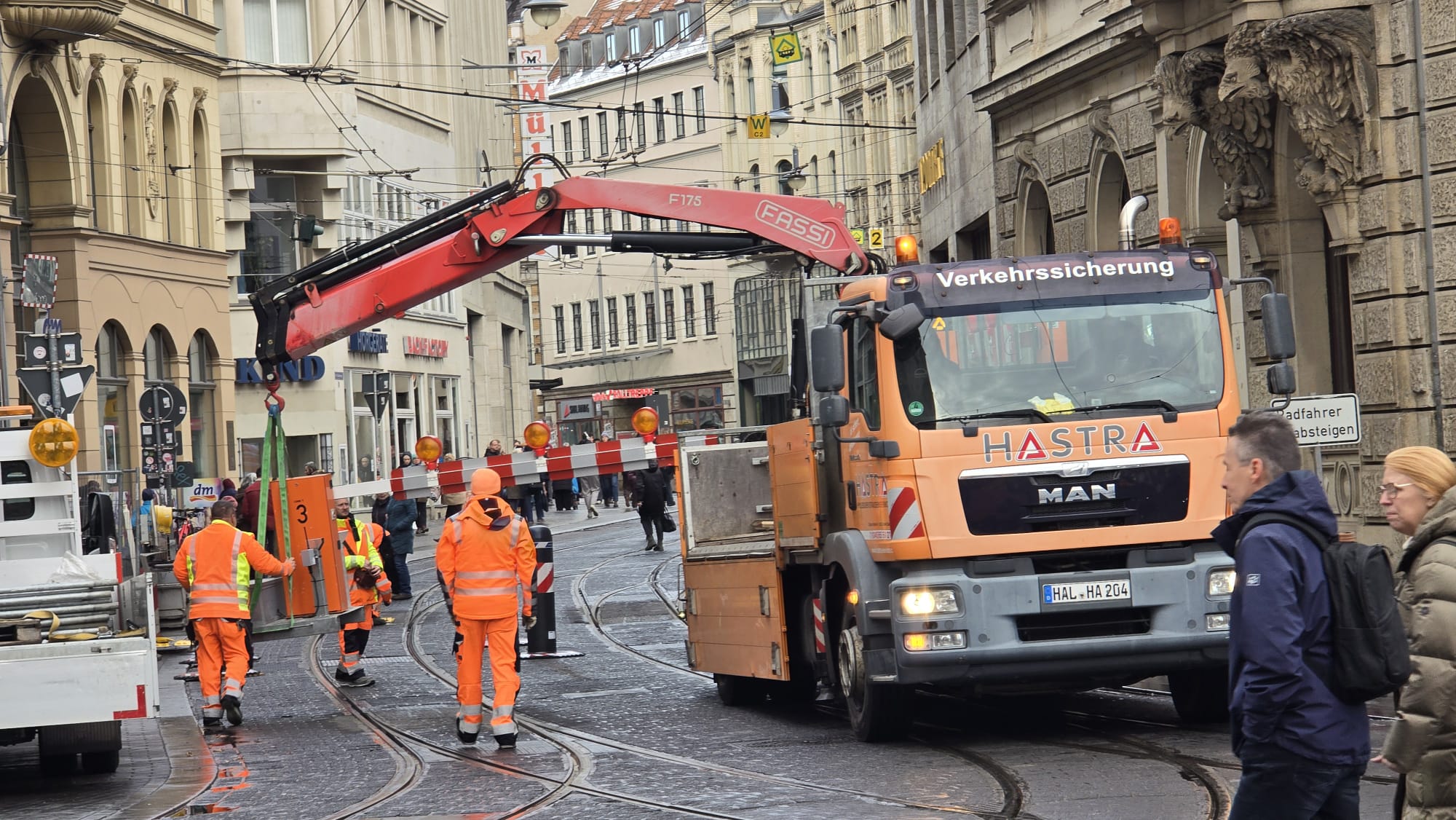Im Rahmen der Absicherung des Weihnachtsmarktes in Halle (Saale) sind am Montag auf den drei Straßenbahnzufahrten zum Markplatz Schleusen aufgebaut worden. Die Anlagen in der Schmeerstraße, Talamtstraße und Kleinschmieden können von Straßenbahnen durchfahren werden, von Kraftfahrzeugen hingegen nicht.