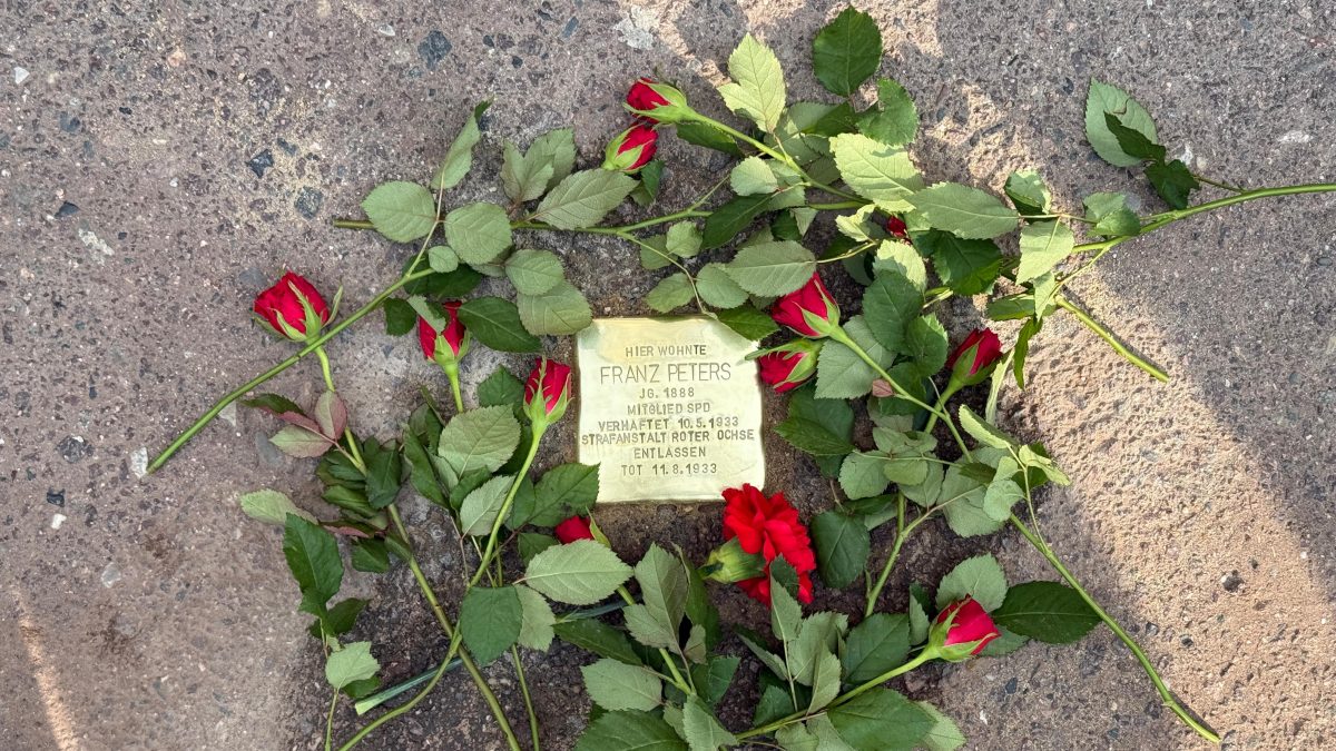 Franz Peters (*1888) lebte in der Willy-Brandt-Straße. Er war Reichstagsabgeordneter für die SPD und stimmte am 23.3.1933 gegen das Ermächtigungsgesetz, das quasi die Abschaffung der parlamentarischen Demokratie in Deutschland bedeutete. Als er im Mai 1933 verhaftet wurde, brach Peters, der in den politisch aufreibenden Jahren zuvor ein Herzleiden entwickelt hatte, zusammen und starb im August 1933. “Wir sind hier, um an einen großen Bürger der Stadt zu erinnern”, sagte die SPD-Landtagsabgeordnete Dr. Katja Paehle. Stolpersteine tragen dazu bei, dass die Namen der Opfer in der Öffentlichkeit bleiben. “Sie sind Verpflichtung und Mahnung zugleich.” Aus dem Ruhrgebiet war eine Enkelin gekommen. Ihren Großvater hat sie nie kennengelernt, sie ist vier Jahre nach dessen Tod geboren. Die vergangenen Wochen seien sehr emotional für sie gewesen, denn die Familiengeschichte wurde aufgearbeitet. Ihr Großvater sei “seelisch und körperlich durch die Nazis zerstört worden.” Deshalb mache ihr das derzeitige Erstarken rechtsextremer Kräfte wie der AfD Angst. “Das ist erschreckend. Ich fühle mich hilflos.” Die frühere Oberbürgermeisterin Ingrid Häußler, der ehemalige Landtagspräsident Rüdiger Fikentscher und der SPD-Fraktionsvorsitzende im Stadtrat Eric Eigendorf, waren gekommen, um Blumen zum Gedenken niederzulegen.
