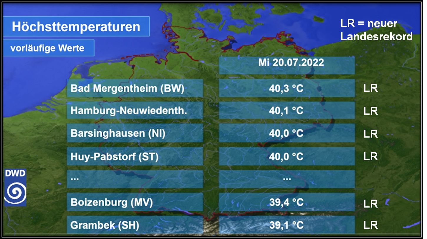 Baden-Württemberg, Hamburg und Niedersachsen meldeten ebenfalls Werte über 40 Grad und einen neuen Rekord für ihre Bundesländer. Neue Landesrekorde gab es auch in Schleswig-Holstein und Mecklenburg-Vorpommern. Hier lagen die temp aber noch knapp unter 40 Grad.