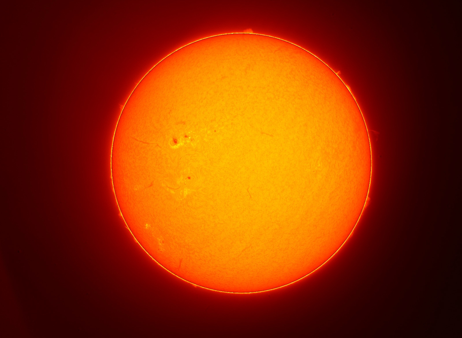 Die Sonne im sogenannten H-Alpha-Licht. Aktuell ist ein riesiger Sonnenfleck sichtbar. Foto: Planetarium Halle (Saale), Michael Reuter