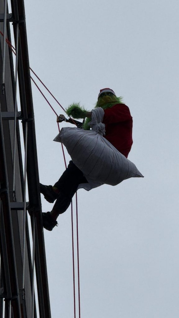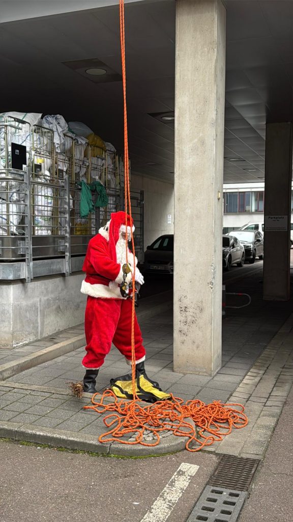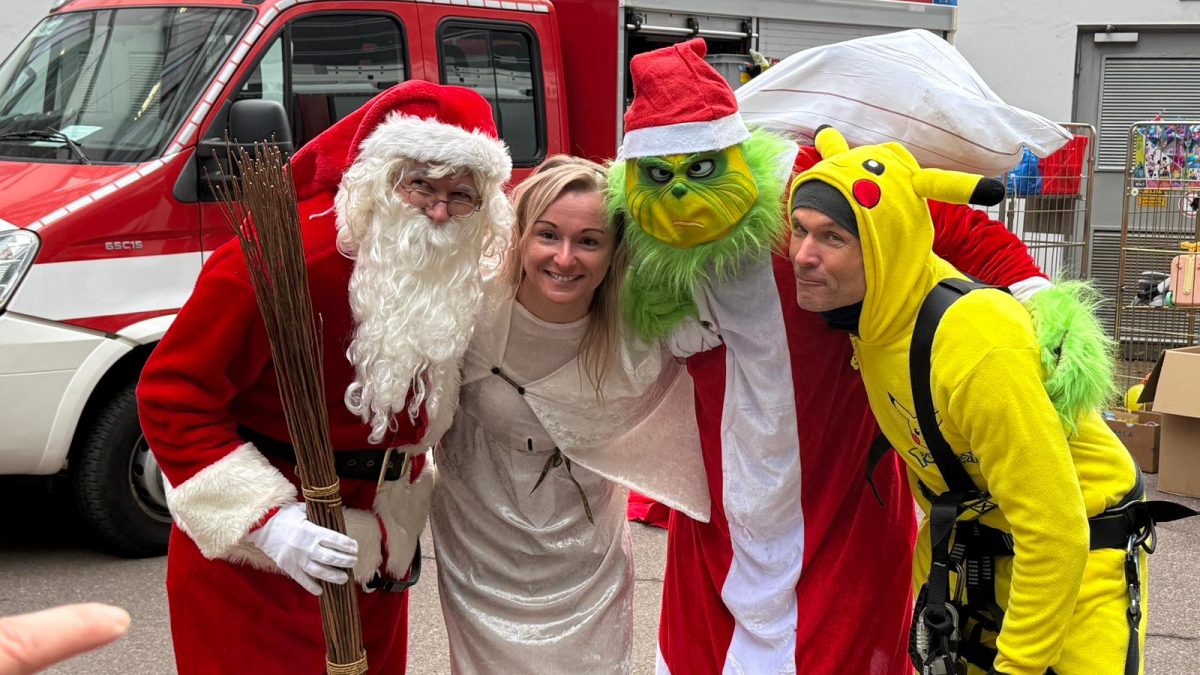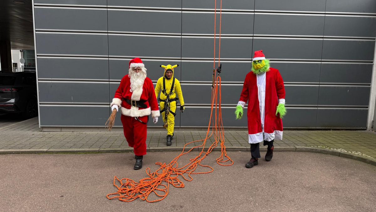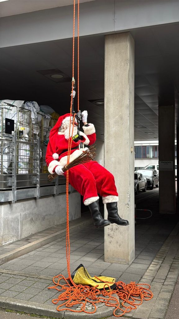 Besonders bemerkenswert ist die Mischung aus Professionalität und spielerischer Leichtigkeit, die das Team an den Tag legt. Die Höhenretter sind spezialisiert auf anspruchsvolle Einsätze – die Rettung aus Höhen und Tiefen, vom Turm, am Gebäude, im schwierigen Gelände. Doch an diesem Tag werden aus Einsatzkräften lebende Weihnachtsfiguren. Damit das gelingt, müssen Kostüme und Sicherheitsausrüstung perfekt miteinander harmonieren. Der Weihnachtsmann-Gurt ist so präpariert, dass der rote Mantel nicht verrutscht. Die Flügel des Engels sind windsicher befestigt. Pikachús Ohren bleiben auch in der Abseilbewegung stabil. Und der Grinch, obwohl wild gestikulierend, bleibt stets sicher im Seil. So entsteht eine Mischung aus Profession und Performance, aus Ernst und Verspieltheit – und genau diese Kombination macht die Aktion so besonders. Denn hinter den farbenfrohen Figuren stehen echte Menschen, die ihre Zeit, ihren Mut und ihr Können schenken, um anderen Freude zu bereiten.