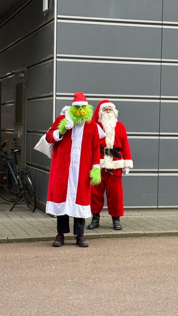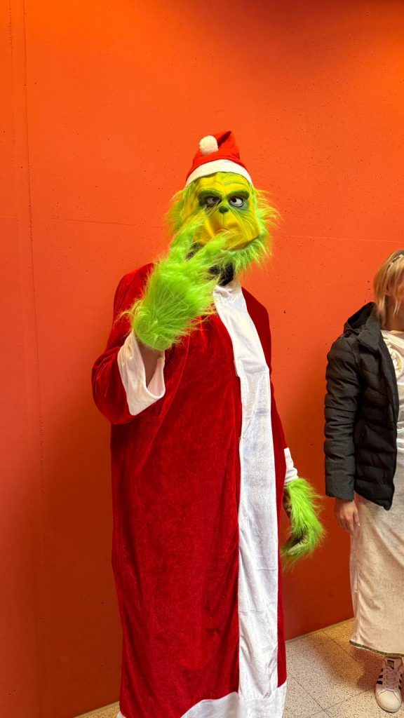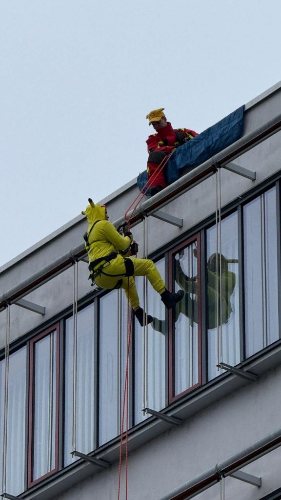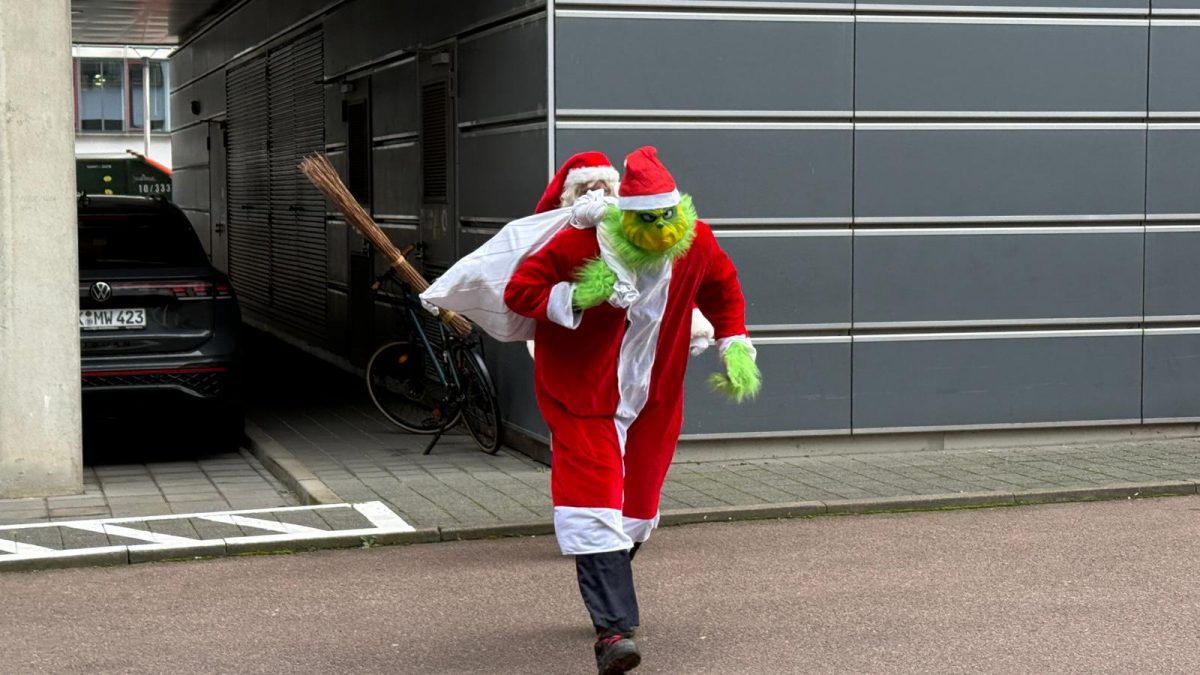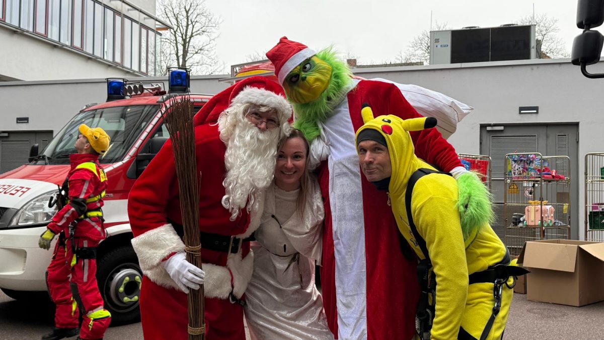 Die Geschichte, die sich an diesem Tag vor den Fenstern der Kinderklinik abspielt, könnte direkt aus einem Weihnachtsfilm stammen. Ganz oben auf dem Dach beginnt das muntere Schauspiel: Der Grinch, in seinem typischen giftgrünen Fell, mit finsterem Blick und einem Sack über der Schulter, legt einen dramatischen Auftritt hin. Er stößt einen frechen Lacher aus, hebt den Sack triumphierend in die Höhe – und lässt damit keinen Zweifel: Die Weihnachtsgeschenke für die Kinder sind futsch! Doch der Grinch hat die Rechnung ohne die anderen Protagonisten gemacht. Mit beeindruckender Eleganz seilt sich kurz darauf ein strahlender Engel ab, dessen Flügel im Wind flattern. Neben ihm schwebt der Weihnachtsmann mit seinem roten Mantel und einem warmherzigen Lächeln. Und mittendrin, mit viel Charme und einem extra großen Batzen Niedlichkeit: Pikachú, das jüngste Mitglied des weihnachtlichen Höhenrettungsteams. Was folgt, ist eine kleine Inszenierung, die in den Fenstern der Klinik für begeisterte Reaktionen sorgt. Manche Kinder klopfen gegen die Scheibe, andere winken oder rufen durch die geöffneten Fenster den Akteur:innen zu. Einige der Kleinsten wissen kaum, wohin sie zuerst schauen sollen – auf das fiese Grinsen des Grinch, die majestätische Ruhe des Engels, die entspannte Autorität des Weihnachtsmanns oder die Possen des fröhlich herumwirbelnden Pikachús. Der Grinch versucht, sich mit dem Sack davon zu schleichen, doch Weihnachtsmann und Engel stellen ihn zur Rede. Gestikreich erklärt der Weihnachtsmann, warum die Geschenke den Kindern gehören, während der Engel dem Grinch freundlich, aber bestimmt ins Gewissen redet. Der Grinch, so will es die Tradition, zeigt sich zuerst uneinsichtig. Doch schließlich lässt er sich von der warmherzigen Botschaft überzeugen. Reumütig gibt er die liebevoll gepackten Geschenke frei. In diesem Moment brandet echter Jubel durch die Klinikflure. Pfleger:innen und Eltern, die den Kindern zur Seite stehen, können sich ein Lächeln nicht verkneifen. Einige Kinder winken dem Grinch zum Abschied, andere jubeln dem Weihnachtsmann entgegen. Für einen kurzen Moment steht die Zeit still – und die Sorgen des Klinikalltags rücken in den Hintergrund.