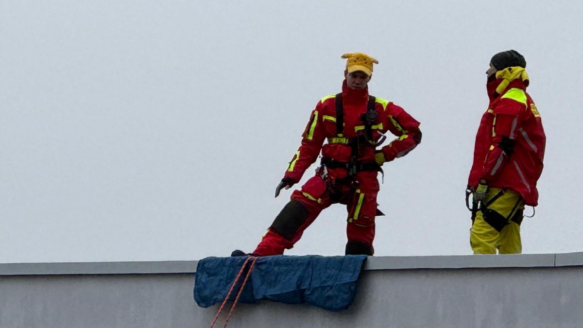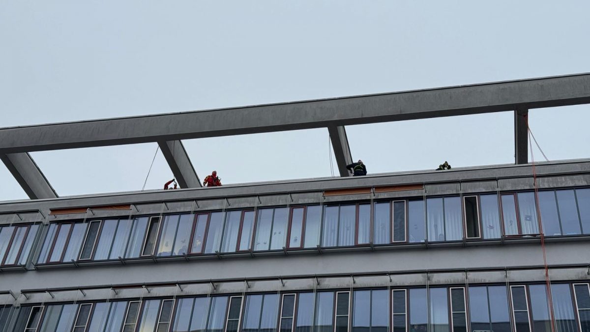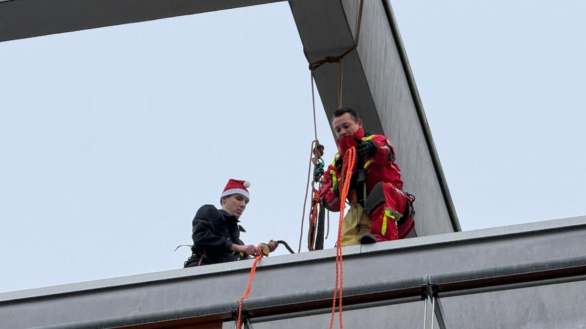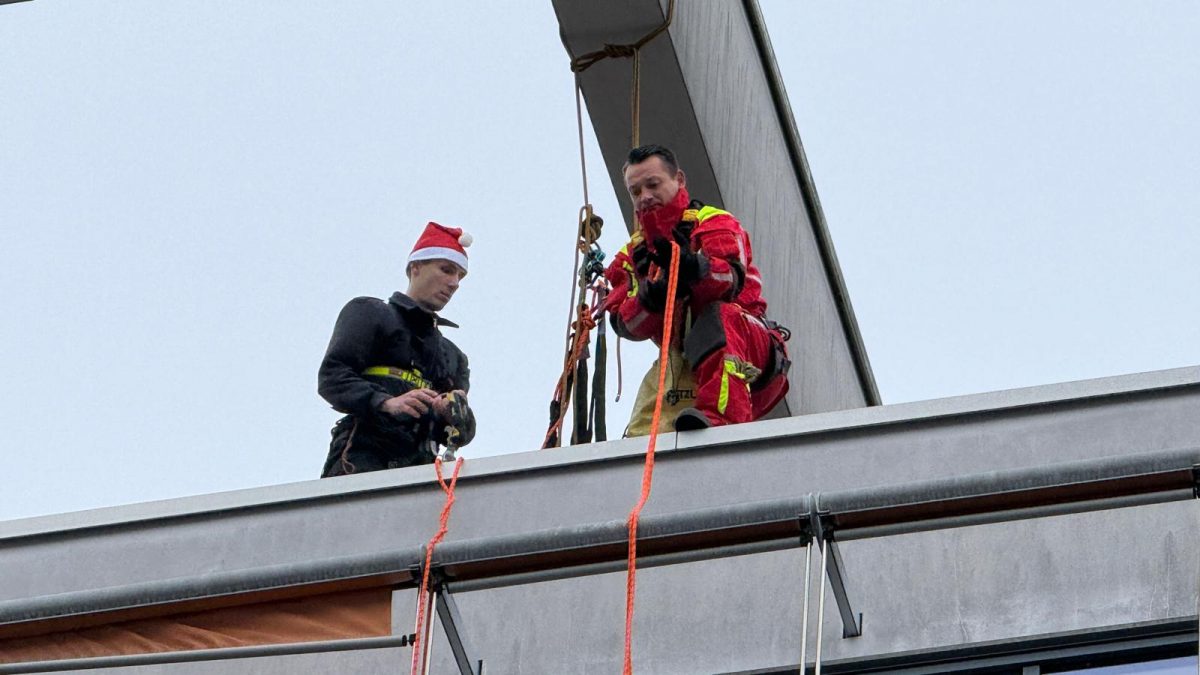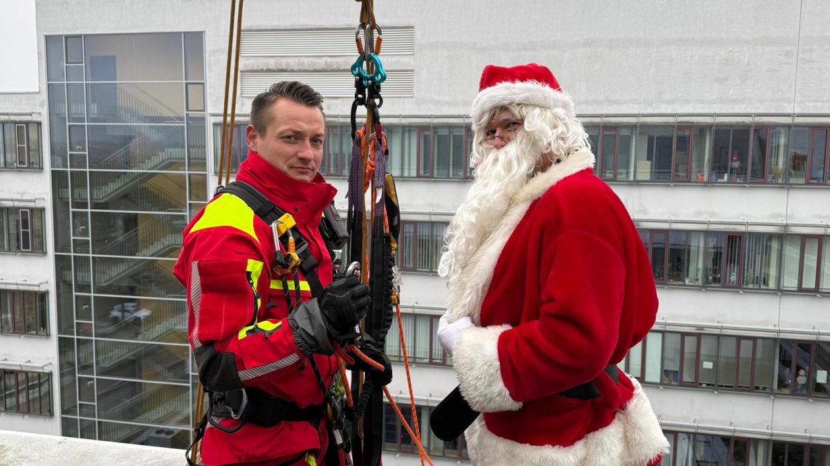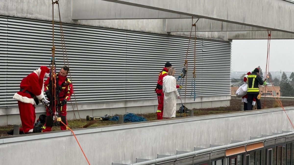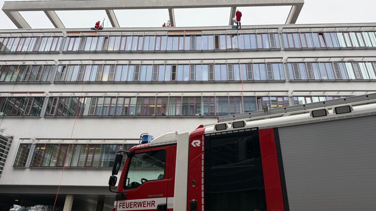 Spezielle Höhenrettungsaktion der Feuerwehr an der Uniklinik: Weihnachtsmann, Grinch und Pikachú seilen sich ab – Geschenke für die Kinder auf Station