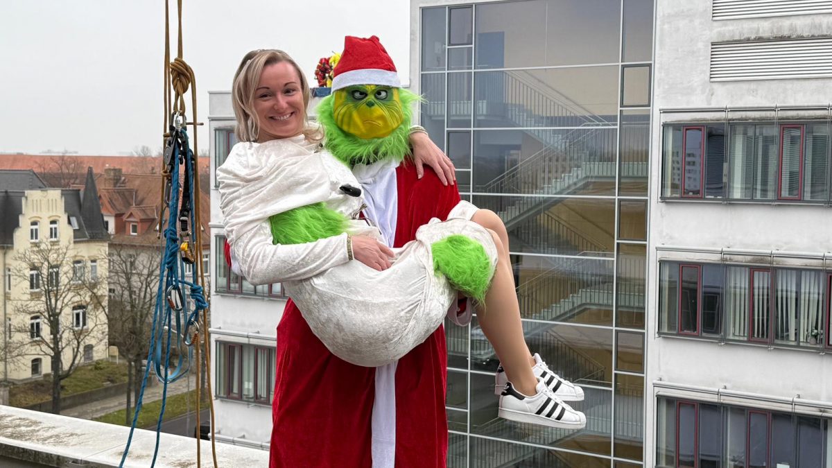 Freitagvormittag, kurz nach zehn Uhr. Ein kalter Wind zieht über die Dächer des Universitätsklinikums Halle. Unten im Innenhof haben sich bereits einige Mitarbeiter:innen versammelt, während auf den Stationen des Departments für operative und konservative Kinder- und Jugendmedizin gespannte Aufregung herrscht. Die Kinder an den Fenstern drücken ihre Gesichter an die Scheiben, manche aufgeregt, manche neugierig und alle voller Erwartung. Dann fällt ein Schatten über die gläsernen Fassaden. Hoch oben auf dem Dach der Kinderklinik regt sich etwas. Erst leise, dann immer deutlicher erscheinen vier farbenfrohe Silhouetten in schwindelerregender Höhe. Und plötzlich wird klar: Die Weihnachtszeit hat am Uniklinikum Halle gerade einen ganz besonderen Höhepunkt erreicht. Vier Höhenretter der Berufsfeuerwehr Halle (Saale) – im Alltag Spezialist:innen für komplexe Rettungseinsätze – haben sich an diesem Adventswochenende einer ganz anderen Mission verschrieben: weihnachtliche Magie direkt ans Krankenbett zu bringen. Doch an diesem Tag tragen sie keine Helme, Einsatzjacken und Seile in leuchtendem Feuerwehrrot. Stattdessen schweben ein grimmiger Grinch, ein fröhlicher Weihnachtsmann, ein strahlender Engel und sehr zur Begeisterung der jüngsten Zuschauer:innen ein festlich geschmücktes Pikachú die Klinikfassade hinab. Es ist ein Anblick, der selbst hartgesottene Klinikmitarbeiter:innen ins Staunen versetzt und der den kleinen Patient:innen die Augen leuchten lässt. Die Traditionsaktion ist im Uniklinikum längst ein Highlight – doch in diesem Jahr wirkt sie noch ein Stückchen magischer.