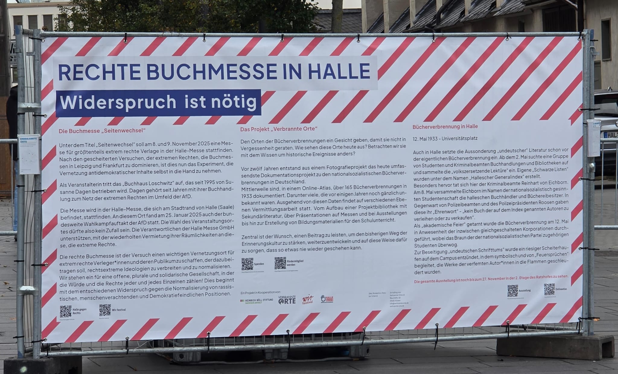 Eine zivilgesellschaftliche Kampagne warnt vor der Teilnahme offen neonazistischer Gruppen an der Buchmesse „Seitenwechsel“, die am kommenden Wochenende (8. und 9. November 2025) in der Halle-Messe stattfinden soll. In einer Mitteilung spricht die Initiative „Rechte Buchmesse stoppen“ von einer „Veranstaltung, auf der der Nationalsozialismus gefeiert“ werde. Konkret kritisiert die Kampagne die Zulassung des „Sturmzeichen Verlags & Versands“, der in der Vergangenheit eng mit der neonazistischen Partei Die Rechte verbunden war. Der Verlag vertreibt unter anderem die Zeitschrift „Nationaler Sozialismus Heute“ sowie Bücher der verurteilten Holocaustleugnerin Ursula Haverbeck. Nach Angaben der Initiative sind Verlag und Betreiber in der extrem rechten Szene fest verankert.