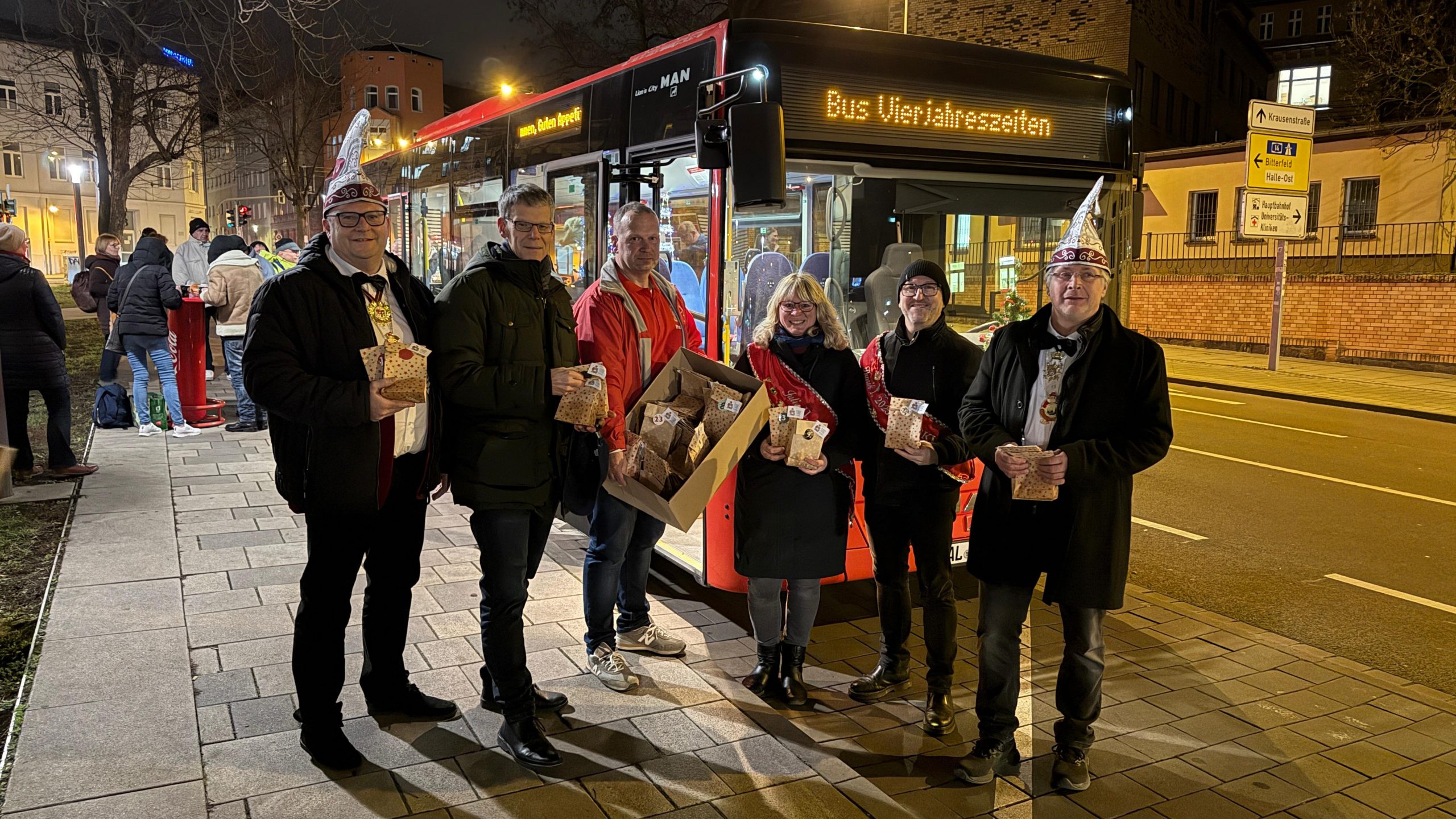 Ein Hauch von Weihnachten wehte am Montagabend am Bus Vierjahreszeiten in Halle (Saale). In einer besonderen Aktion verteilten Bürgermeister Egbert Geier und die Vorstände des HSKV e.V. sowie des KCE Saxonia e.V. insgesamt 111 Tüten frisch gebackener Plätzchen an bedürftige Menschen der Stadt.