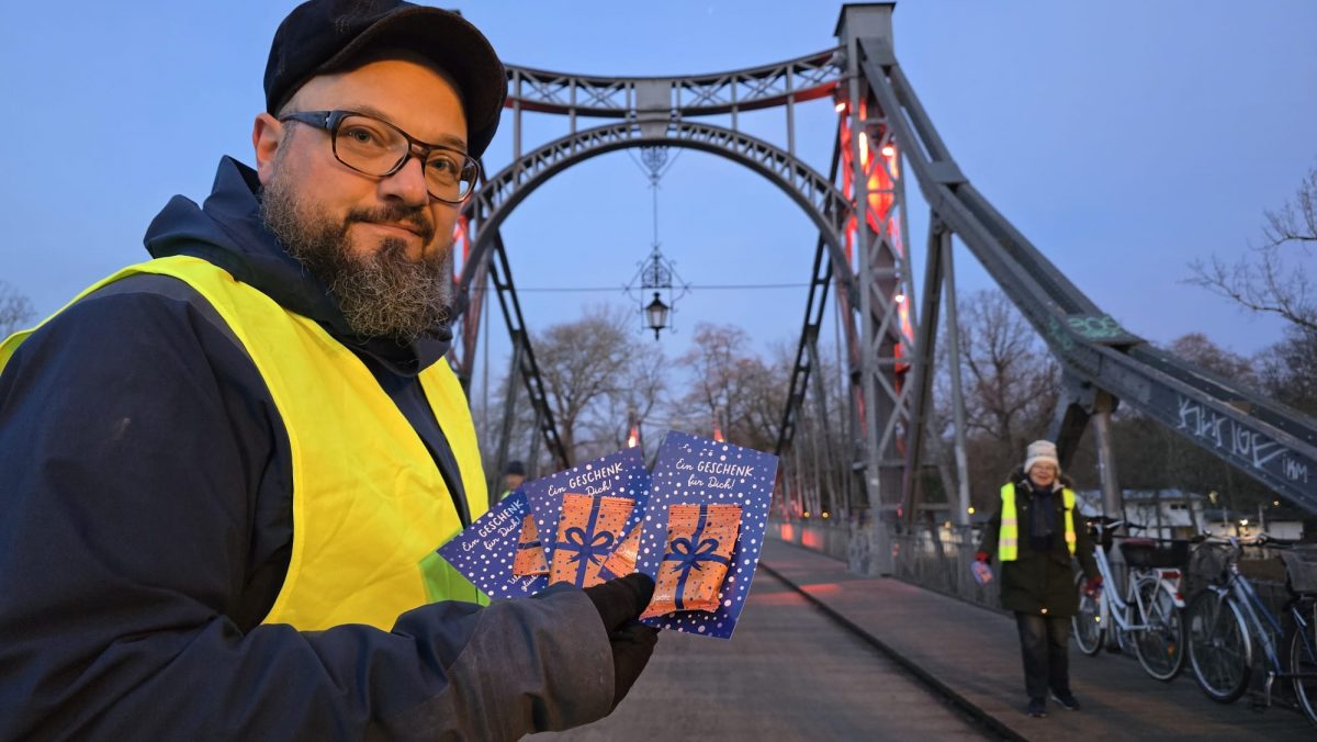 Süße Überraschung für Radler auf der Peißnitzbrücke: ADFC verteilt Lebkuchen