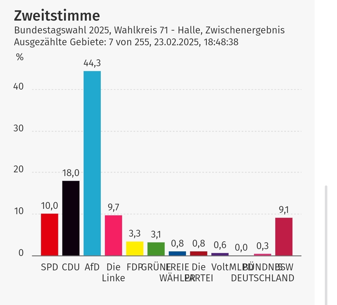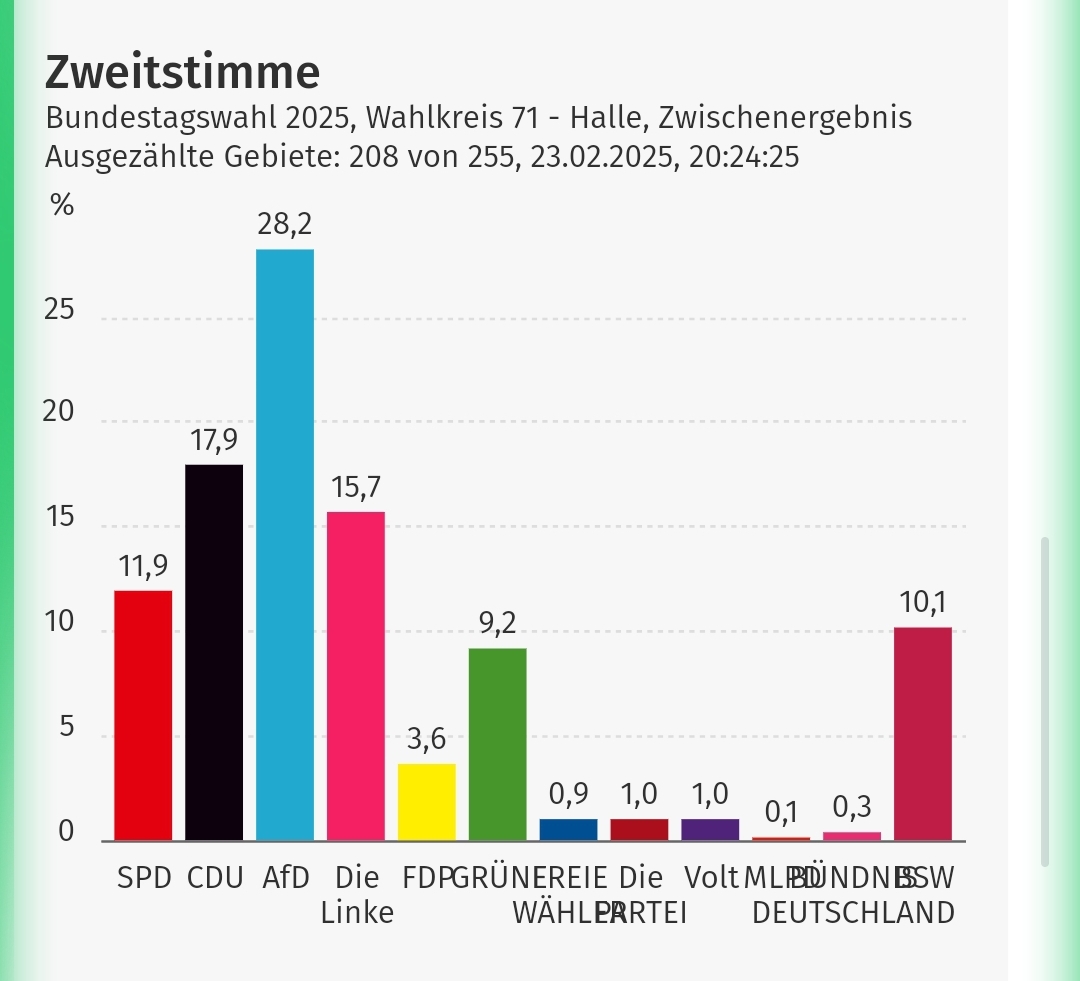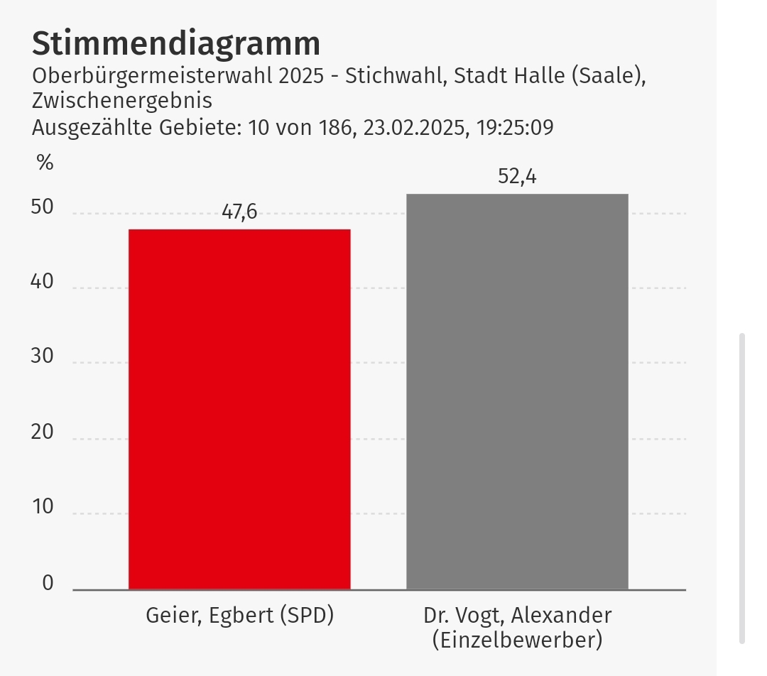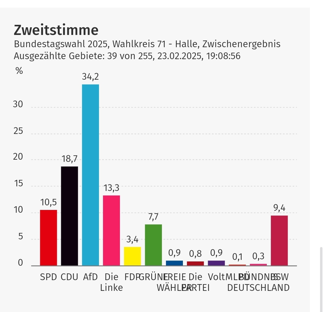 Wenn ich mir die vorläufigen Wahlergebnisse zur OB-Wahl auf https://wahlergebnisse.halle.de/OBWS2025/ angucke, dann wird mir Angst und Bange. Es zeichnet sich ein Gefälle zwischen progressiven bzw. bildungsnahen Stadtvierteln (vorrangig in der Innenstadt) und reaktionären bzw. bildungsfernen Vierteln (vorrangig Stadtrandbezirke) ab, ähnlich den polarisierenden Ergebnissen des Bürgerentscheids zur autofreien Altstadt. Es ist unglaublich, wie die Marionetten auf einen selbstgefälligen Schwätzer reinfallen.