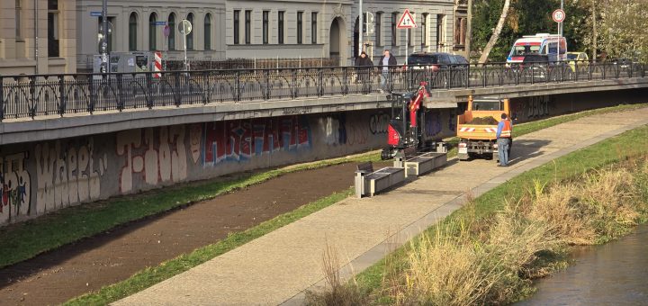 Die Flaniermeile am Mühlgraben neben dem Robert-Franz-Ring entwickelt sich zur Dauerbaustelle. Wegen Lieferproblemen ruhten die letzten Wochen erneut die Arbeit. Seit Montag wird nun wieder gewerkelt. Derzeit finden Pflasterarbeiten statt.