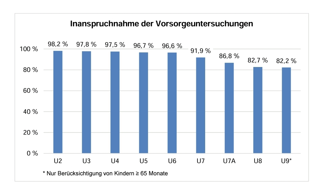 Insgesamt nimmt die Teilnahmehäufigkeit mit zunehmendem Alter der Kinder ab. Während die Vorsorgeuntersuchungen im ersten Lebensjahr (U2 bis U6; U1 erfolgt direkt nach der Geburt und wird nicht berücksichtigt) noch jeweils bei ca. 97 % der Kinder durchgeführt wurden, sank die Teilnahme bei den Untersuchungen U8 und U9 im Alter von 4 bzw. 5 Jahren auf etwa 82 %.