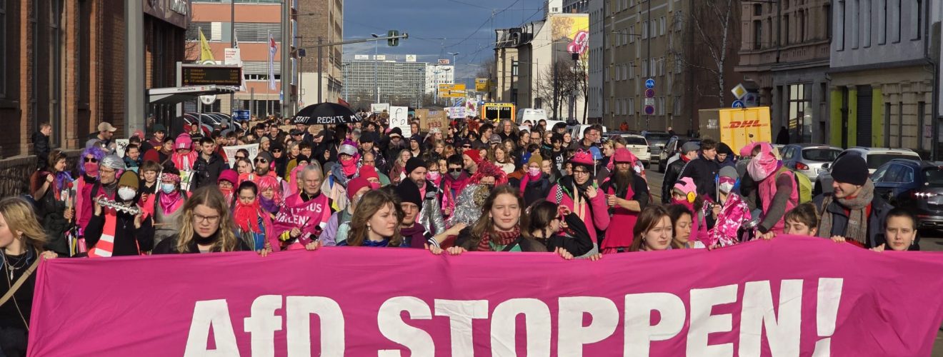 Am heutigen 25. Januar 2025 finden in Halle (Saale) der Wahlkampfauftakt der AfD in der Halle-Messe sowie mehrere Gegenproteste und Demonstrationen statt. An dieser Stelle wird kontinuierlich über das Geschehen informiert. 15.00 Uhr: Zwischenfazit … Über Neuntausend Menschen bei Protesten gegen AfD-Wahlkampfauftakt in Halle (Saale) – Reißzwecken ausgelegt, Verletzte bei Pfefferspray-Angriff weiterlesen