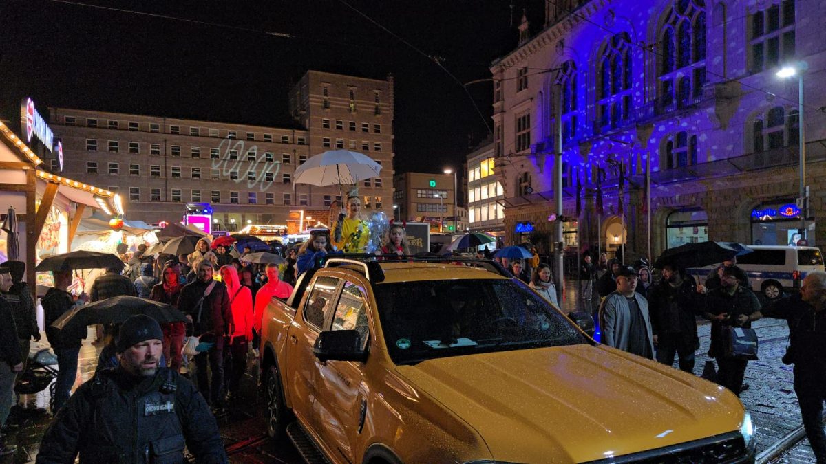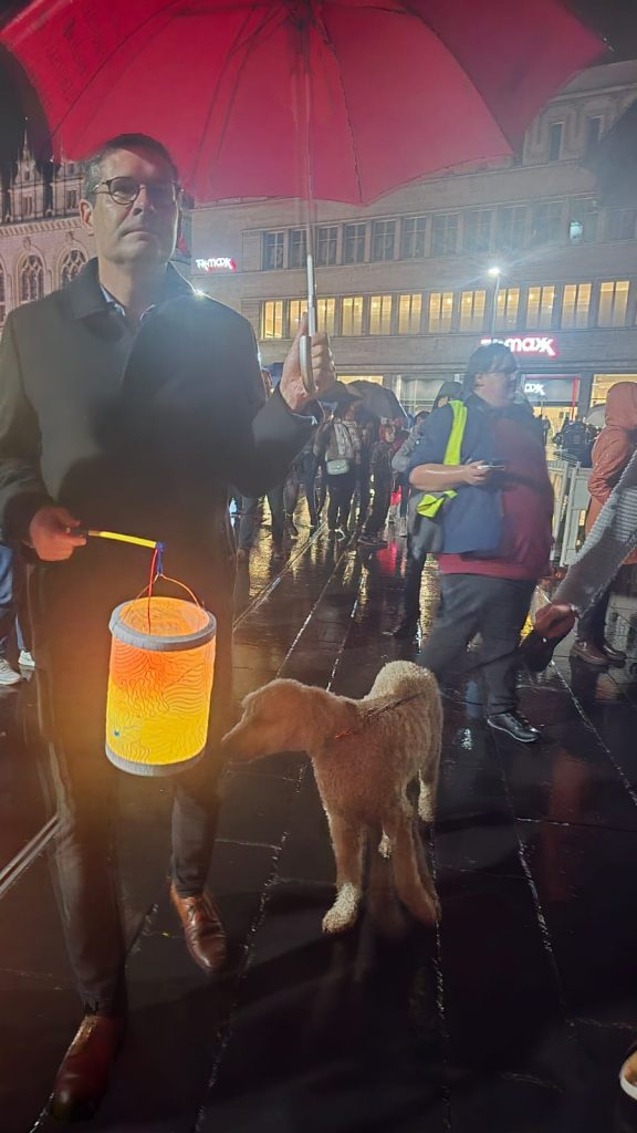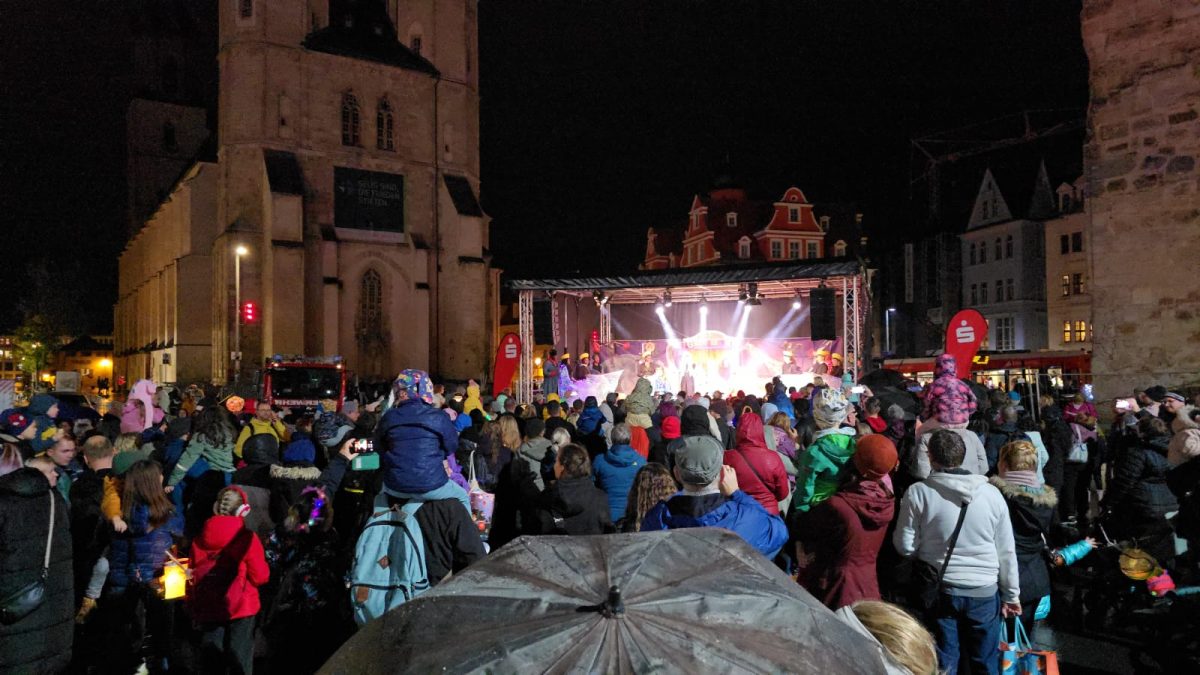 Obwohl es in Strömen regnete, war der Marktplatz in Halle (Saale) am Samstagabend prall gefüllt. Groß und Klein verfolgten die rund 15 Minuten lange Lasershow. Schon davor zogen hunderte Kinder und Eltern, angeführt von der Lichterfee, in einem Laternenumzug vom Hauptbahnhof über der Boulevard zum Marktplatz. An dem nahm auch Oberbürgermeister Dr. Alexander Vogt mit seinem Hund Henri teil. Zuvor gab Lichterfee Linda I. noch den symbolischen Startschuss für die neue Beleuchtung der Kuppelhalle im Hauptbahnhof. Zudem spielte die Lichterfee „Sonne, Mond und Sterne“ auf ihrer Harfe, danach las sie noch eine Geschichte vor und „Sternenstaub“ wurde an die Kinder verteilt, Süßigkeiten.
