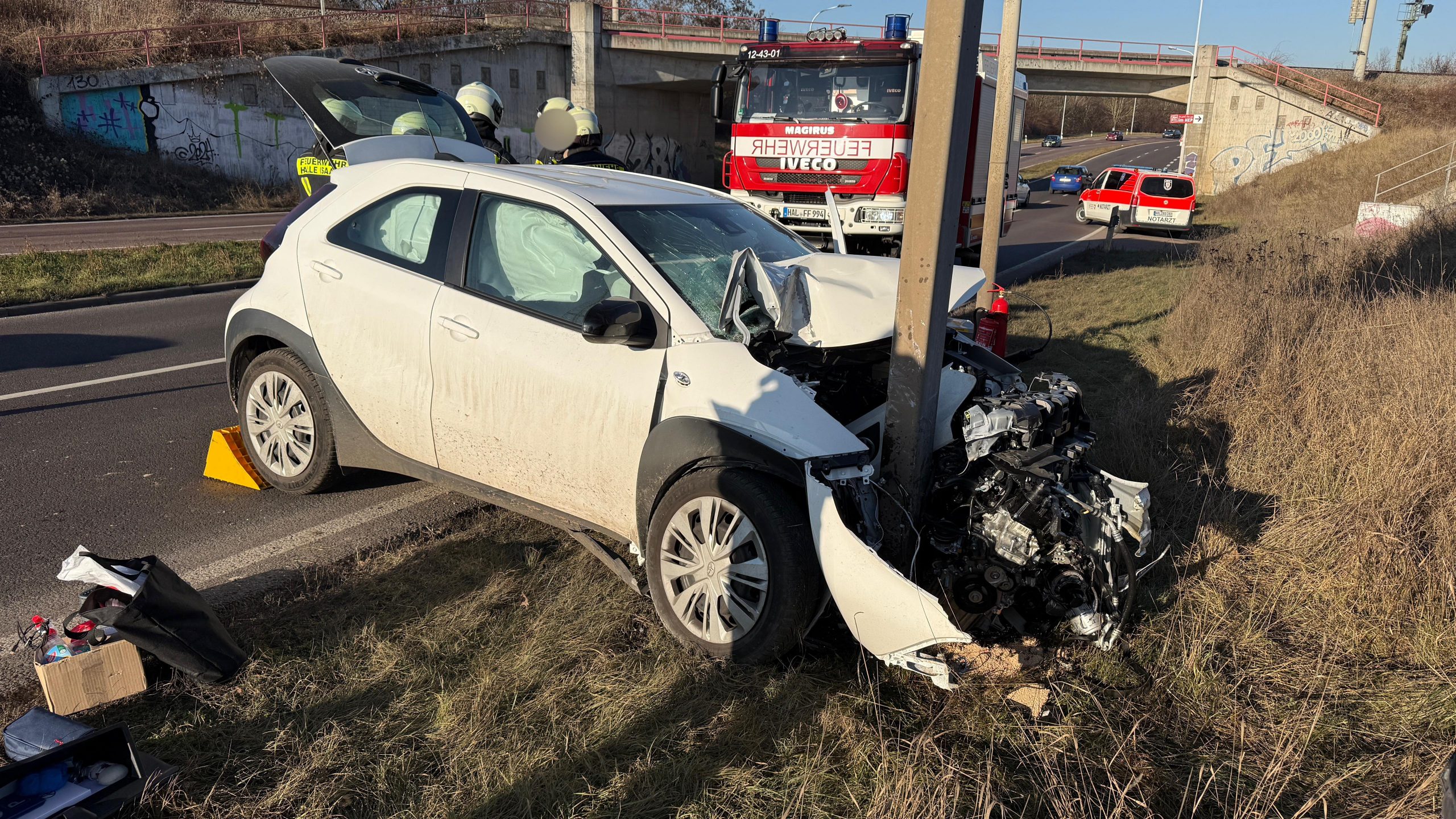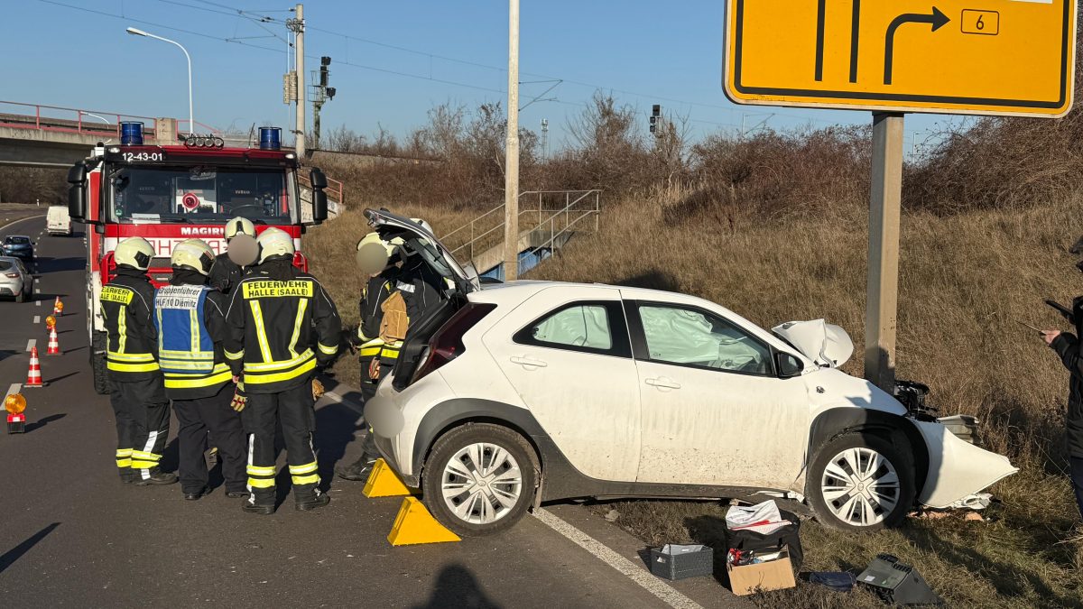 Am beteiligten PKW entstand erheblicher Sachschaden. Dieser musste durch einen hinzugezogenen Bergedienst aus dem Unfallbereich geborgen werden. Durch das Polizeirevier Halle (Saale) wurden die Ermittlungen zum Unfallhergang aufgenommen. Diese dauern zum jetzigen Zeitpunkt an. Im Rahmen der Unfallaufnahme und medizinischen Erstversorgung kam es zur Sperrung eines Fahrstreifens. Hierdurch kam es zu Einschränkungen im Fahrzeugverkehr.