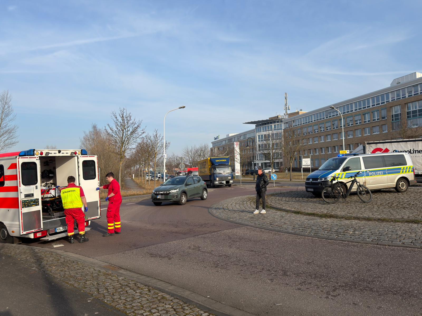 Am Montagmorgen hat sich im Kreisverkehr Eierweg in Halle (Saale) ein Verkehrsunfall ereignet. Ein Fahrradfahrer wurde hier von einem PKW angefahren. Der Radler wurde mit Blaulicht ins Krankenhaus gefahren. Für die Rettungsmaßnahmen war der Kreisverkehr zwischenzeitlich gesperrt.