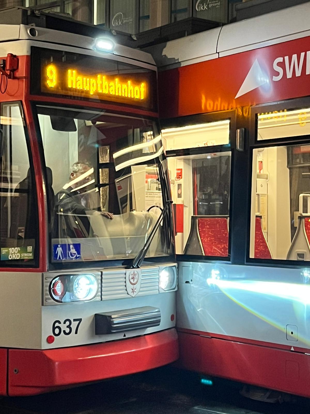 Am Dienstagabend kurz vor 17 Uhr, als gerade parallel der Weihnachtsbaum angeknipst wurde, hat sich zwischen Marktplatz und Kleinschmieden ein Verkehrsunfall ereignet. Dort sind zwei Straßenbahnen kollidiert. Auslöser war offenbar eine falsch gestellte Weiche. Verletzt wurde niemand. Es bleibt bei Blechschäden, auch die Scheibe einer Tür wurde zerstört.