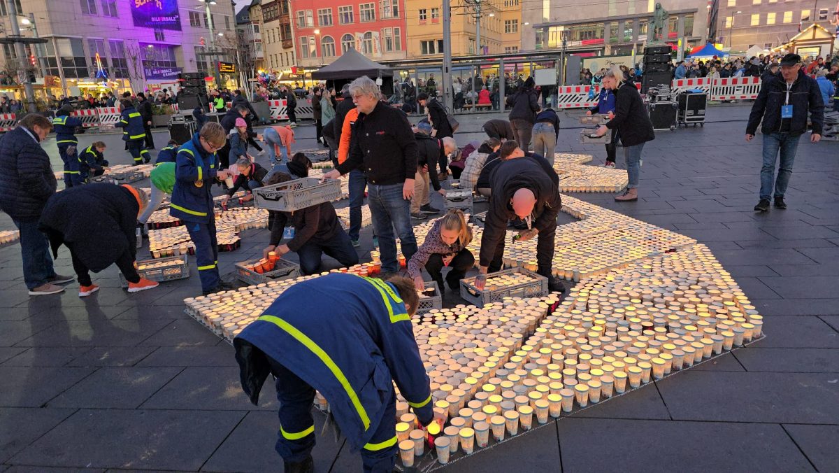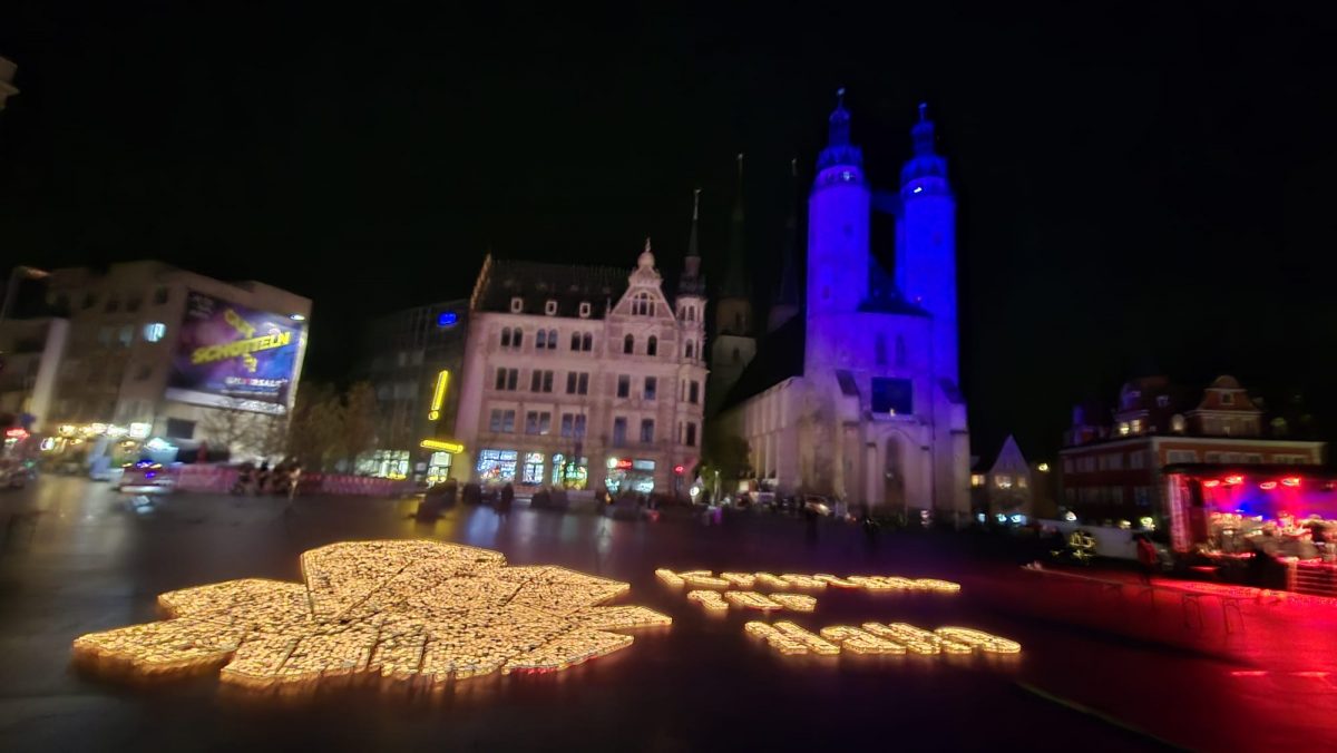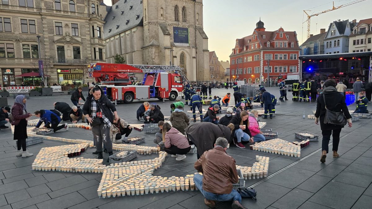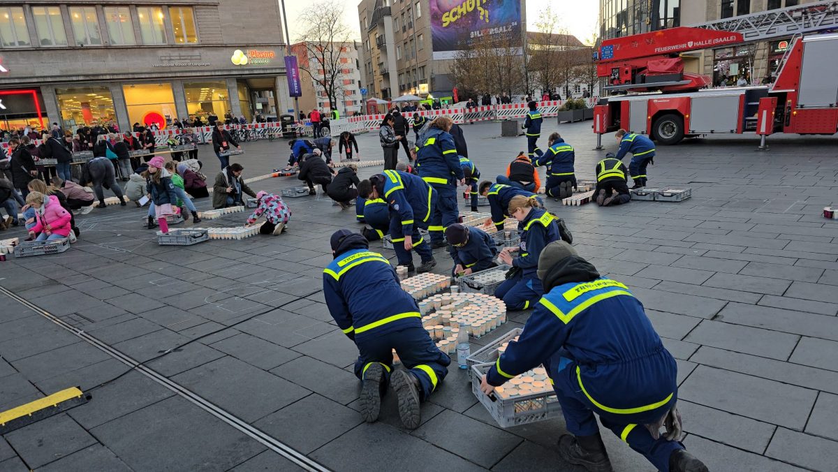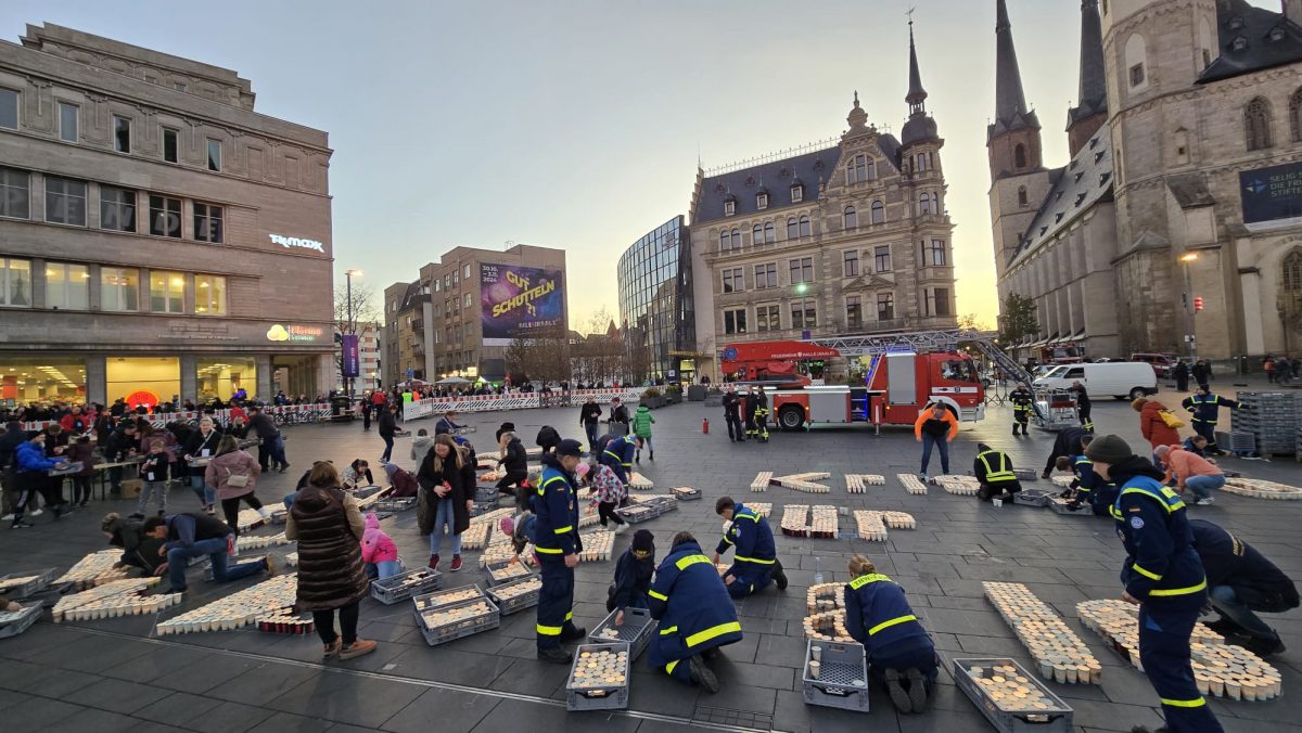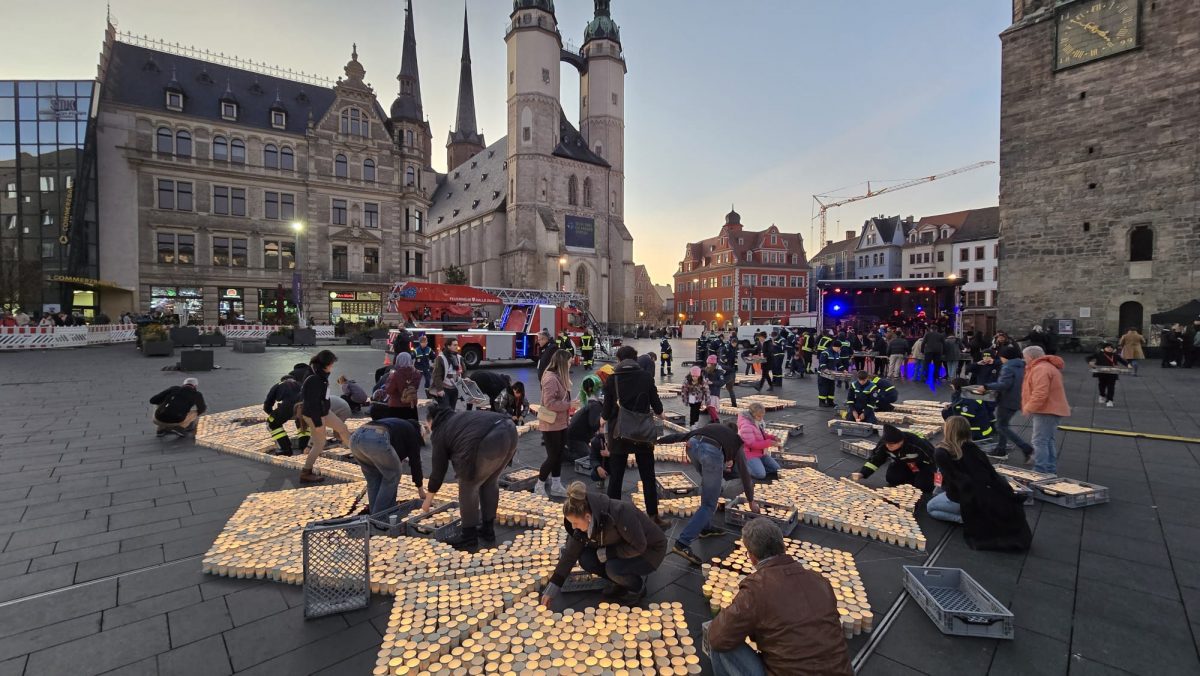 Sonntag entstand auf dem Marktplatz ein Lichterbild. 11.846 Teelichter leuchteten und bildeten den Schriftzug “Kristalle für Halle” und einen stilisierten Salzkristall. Aud der Bühne standen unter anderem die Uni-Bigband und Opernsänger Claus Ostertag. Zum Abschluss zündete Bombenschmidt noch sein Feuerwerk.
